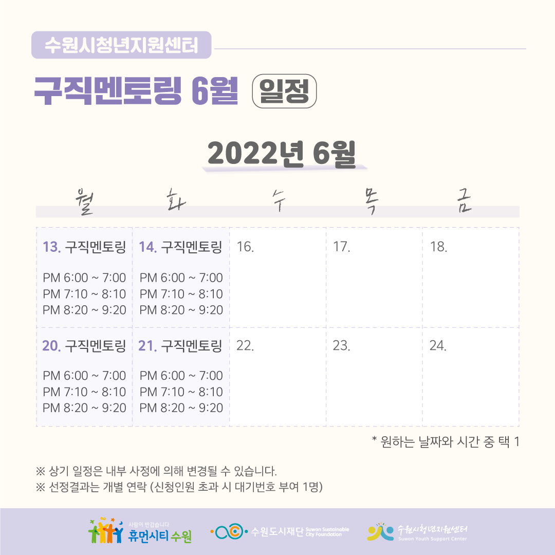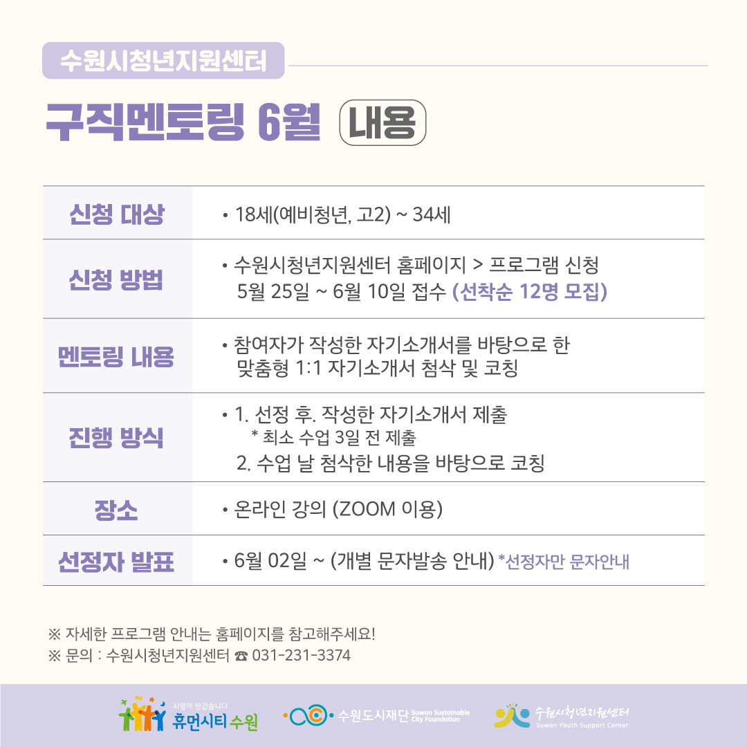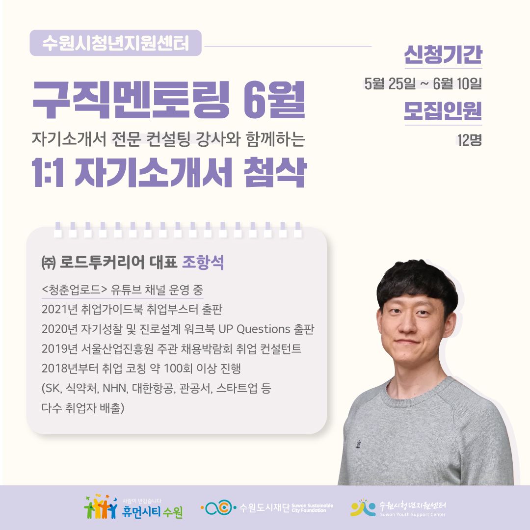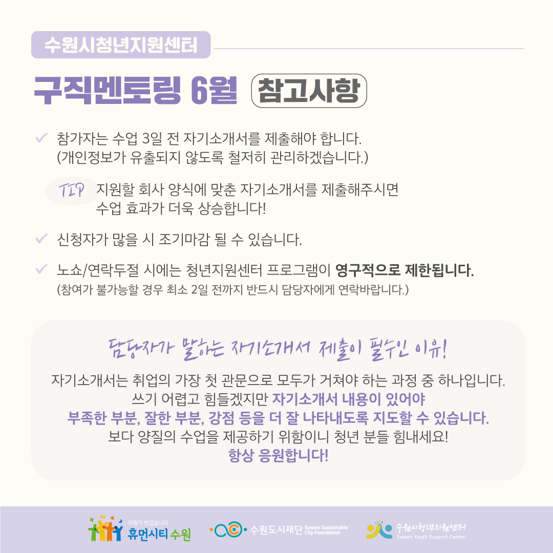 수원시청년지원센터 6월 구직멘토링 : 1:1 자기소개서 첨삭