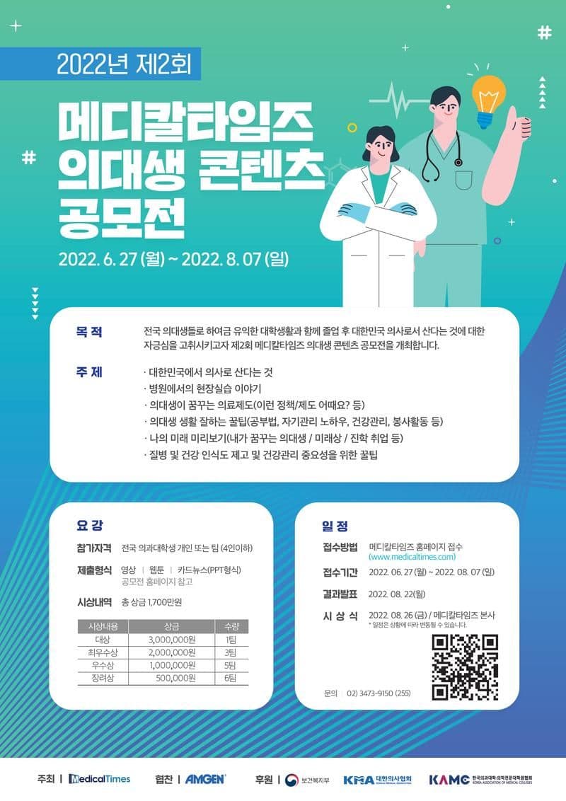 전국 의대생들로 하여금 유익한 대학생활과 함께 졸업 후 대한민국 의사로서 산다는 것에 대한 자긍심을 고취시키고자 제2회 메디칼타임즈 의대생 콘텐츠 공모전을 개최합니다.