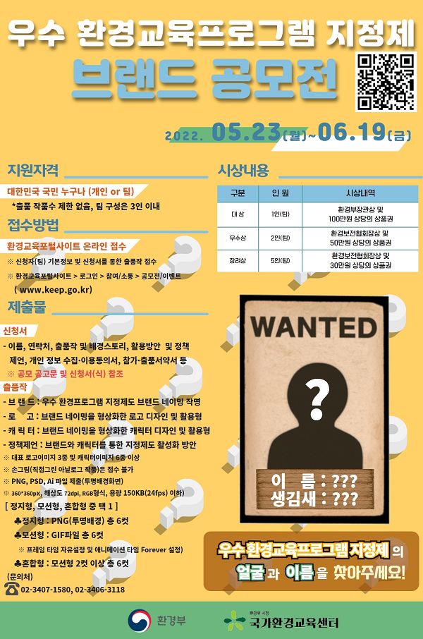‘우수 환경교육프로그램 지정제도’는? □ 신뢰할 수 있는 우수한 환경교육프로그램을 국민에게 제공하기 위해 프로그램의 친환경성, 우수성, 안전성을 심사하여 환경부 장관이 지정하는 국가 지정제도입니다. □ 우수 환경교육프로그램 지정제도가 국민에게 더욱 친근하게 다가가기 위해 브랜드와 함께 로고, 캐릭터 공모전을 개최하오니 많은 참여바랍니다. ※ 제도소개 url : 환경교육포털사이트(www.keep.go.kr/portal/199) |