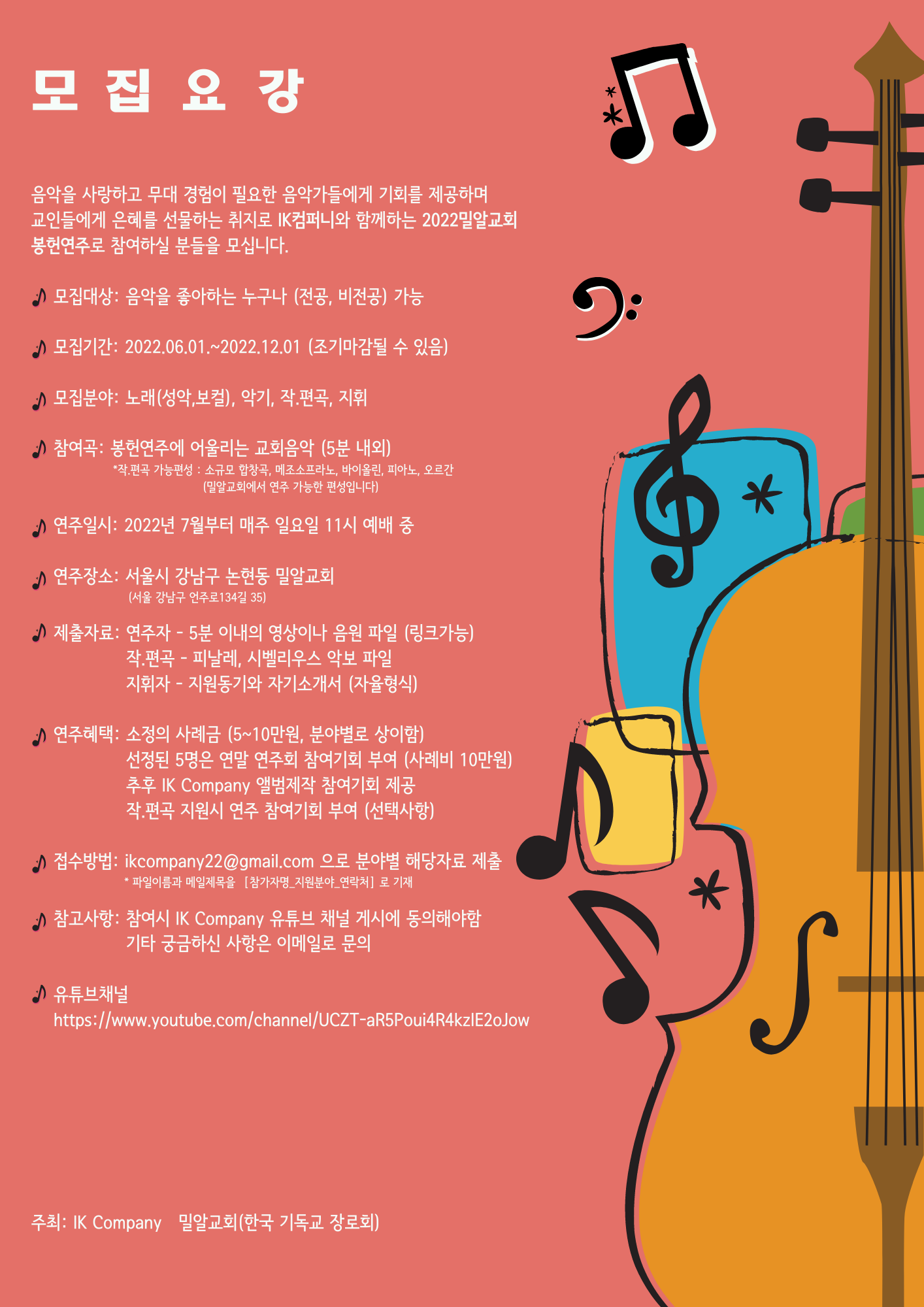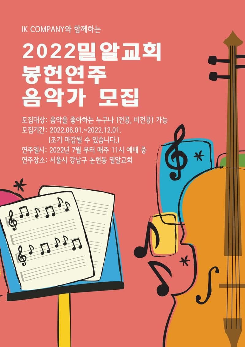 음악을 사랑하고 무대 경험이 필요한 음악가들에게 기회를 제공하며 교인들에게 은혜를 선물하는 취지로 IK 컴퍼니와 함께하는 2022 밀알교회 봉헌(노래, 연주, 작,편곡, 지휘)으로 참여하실 분들을 모십니다.