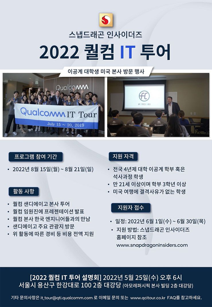 퀄컴코리아는 올 여름 국내 이공계 대학(원)생을 대상으로 퀄컴 미국 본사 방문 프로그램인 ‘퀄컴 IT Tour’를 개최합니다.