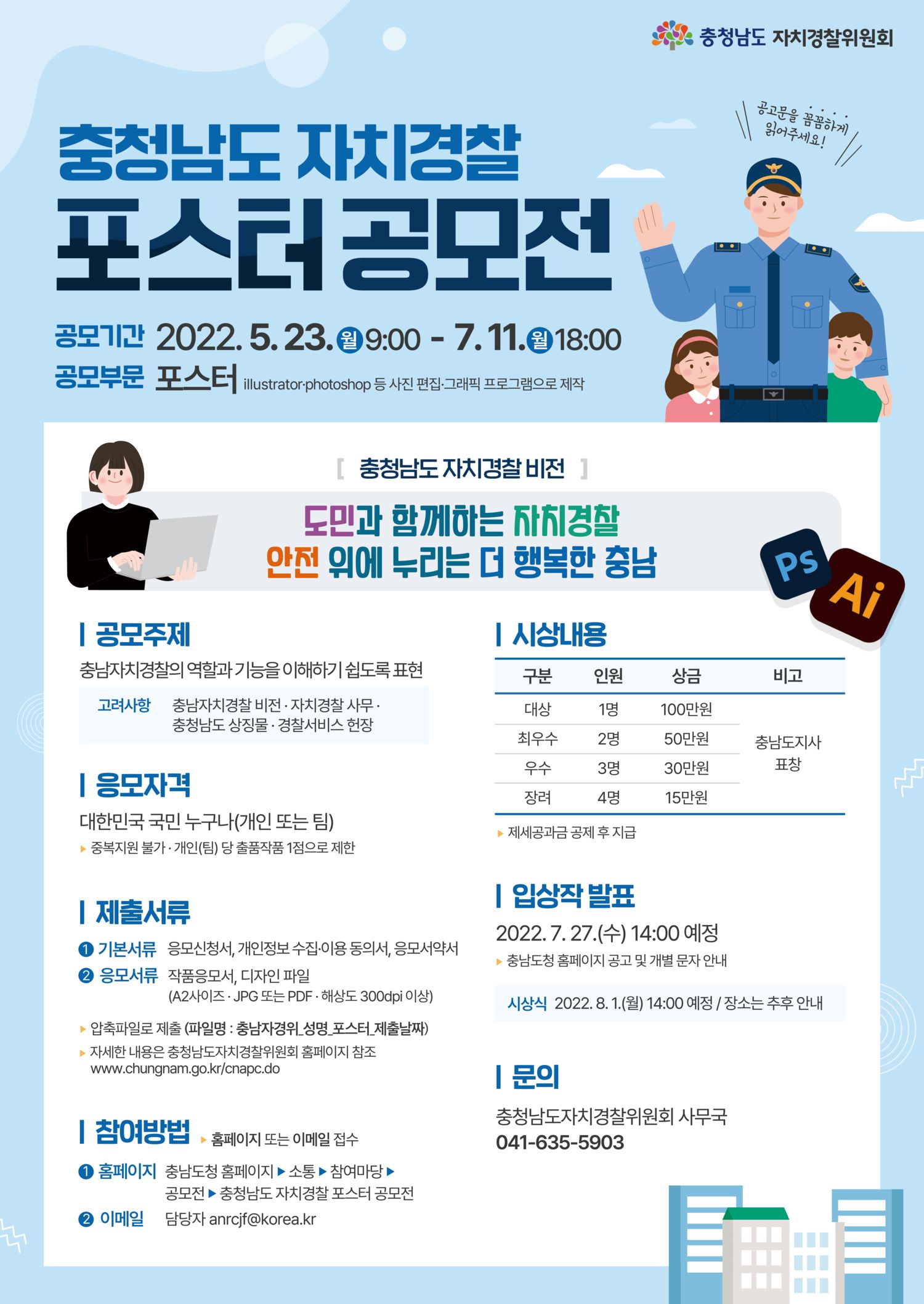 충남자치경찰에 대한 인식도를 제고하고 전국민적 공감대 확산을 위하여 시행하는 「충청남도 자치경찰 포스터 공모전」을 우리 도 홈페이지에 붙임과 같이 공고하고자 합니다.