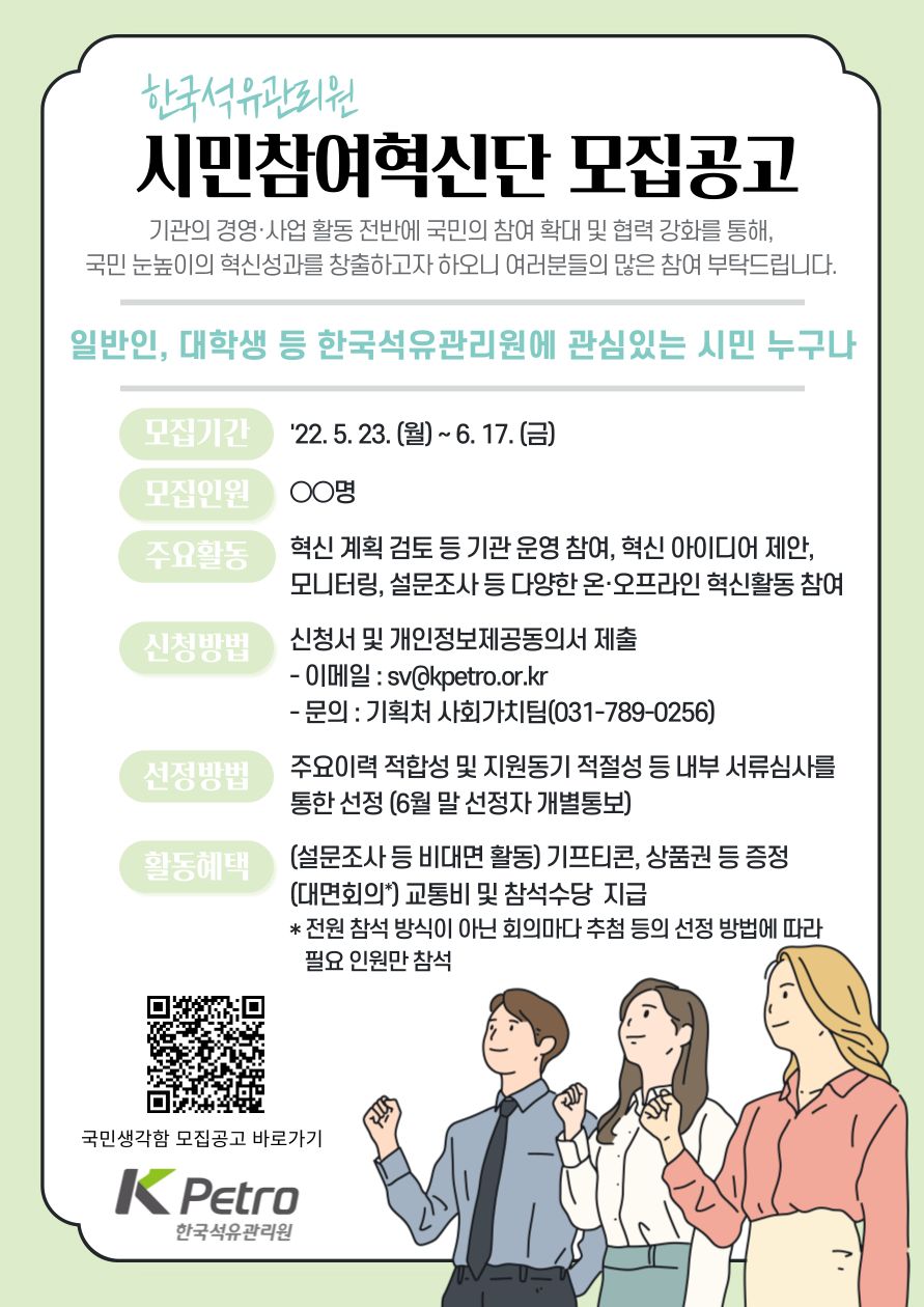 □ (접수방법) 시민참여혁신단 신청서 및 개인정보활용동의서(www.kpetro.or.kr 대표홈페이지에서 다운로드)를 작성하여 이메일(sv@kpetro.or.kr)로 접수