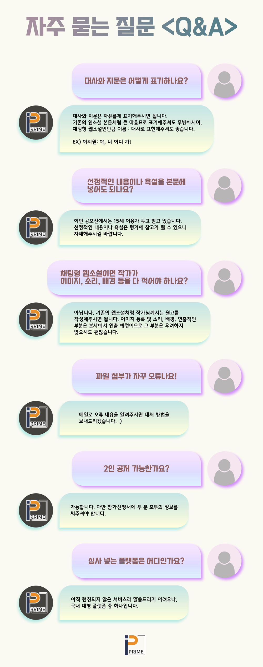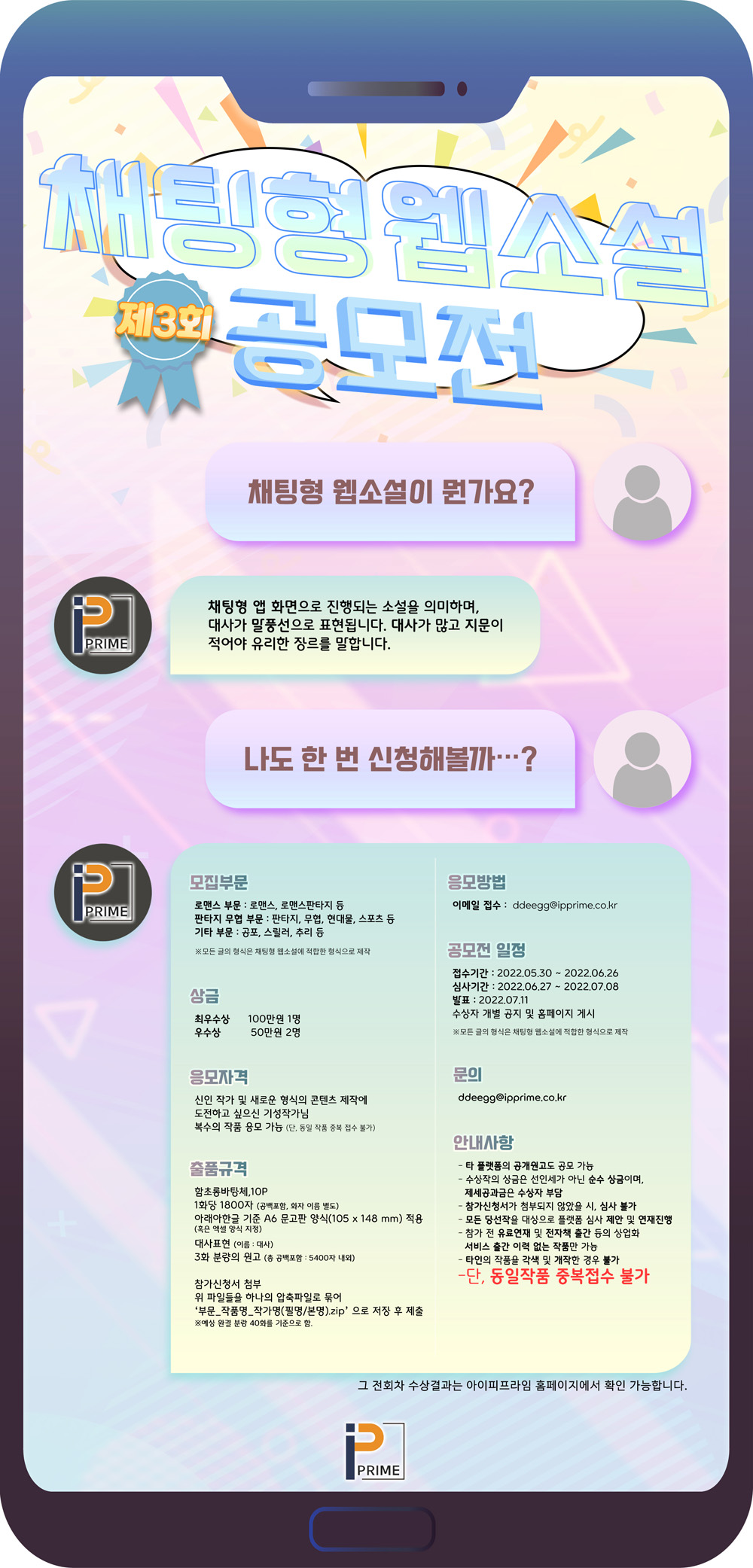 ※채팅형 웹소설: 채팅형 앱 화면으로 진행되는 소설을 의미하며, 대사가 말풍선으로 표현됨. 대사가 많고 지문이 적어야 유리한 장르.