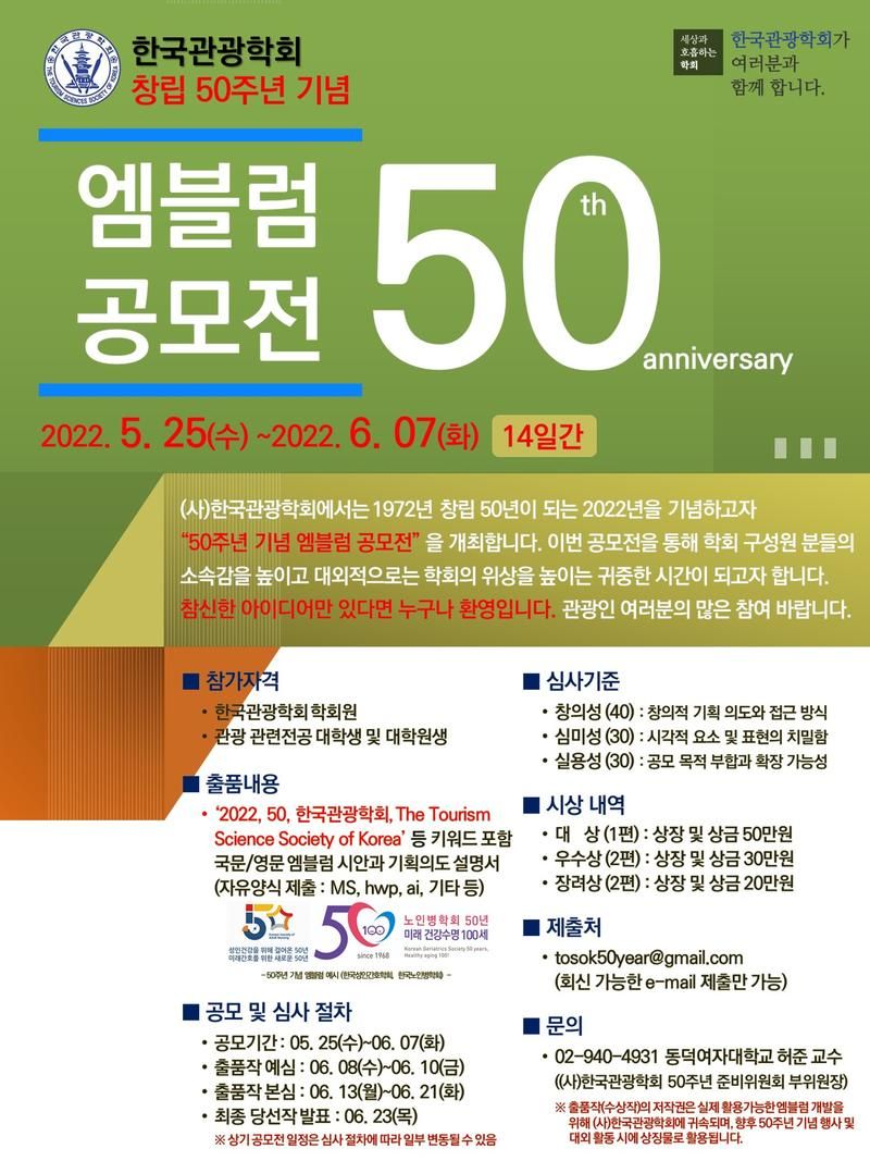 (사)한국관광학회에서는 1972년 창립 50년이 되는 2022년을 기념하고자 "50주년 기념 엠블럼 공모전"을 개최합니다. 이번 공모전을 통해 학회 구성원 분들의 소속감을 높이고 대외적으로는 학회의 위상을 높이는 귀중한 시간이 되고자 합니다.