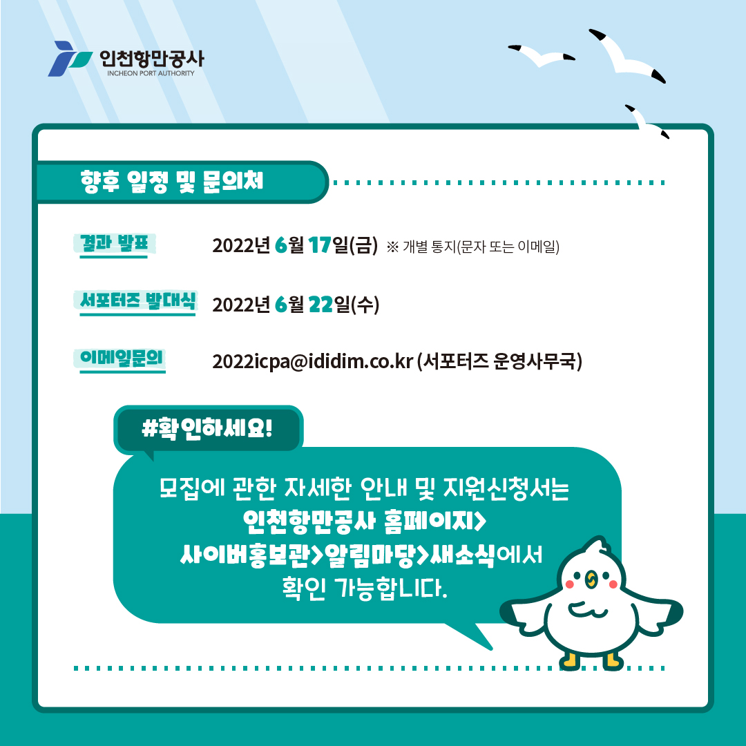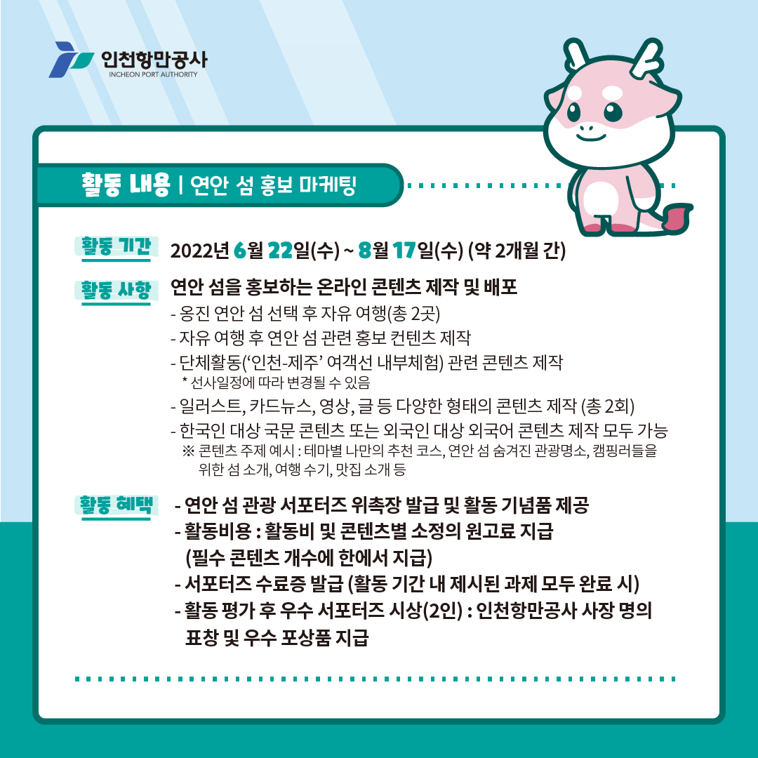 - 제작 콘텐츠는 인천항만공사 공식 SNS 및 홈페이지에 업로드, 마케팅용으로 사용될 수 있음