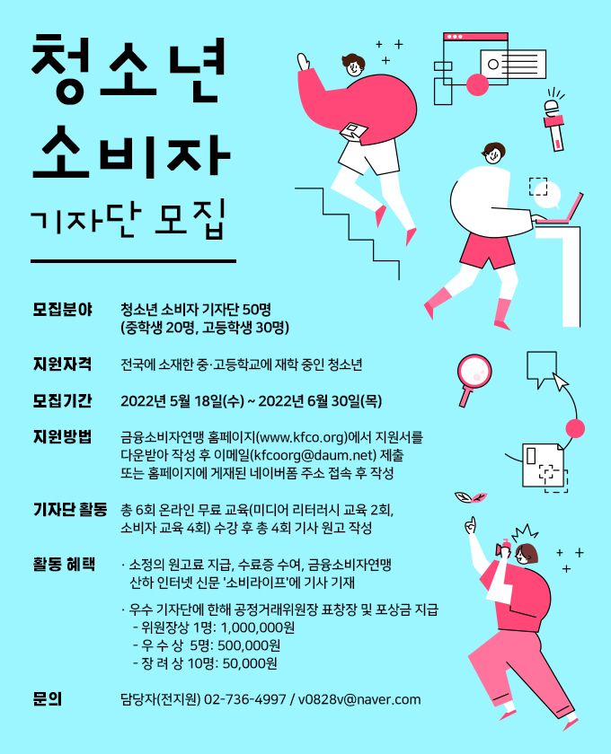 금융소비자연맹에서 청소년의 현명한 소비의 길잡이 역할과 합리적인 소비의 가치관 형성을 도모하기 위해 공정거래위원회의' 2022년도 소비환경개선사업'의 일환으로 생활 속에서 소비자 정보와 문제를 발굴, 취재하는 청소년 소비자 기자 50명을 모집합니다.