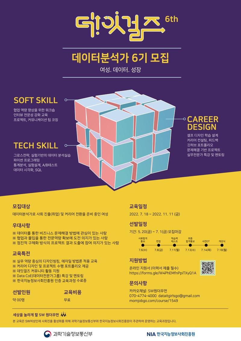 SW여성인재 역량강화 및 인식확산을 위해 과학기술정보통신부와 한국지능정보사회진흥원이 주관하는 데이터분석가 양성 과정 『데잇걸즈』 6기를 시작합니다. 『데잇걸즈』 는 데이터와 IT에 전문성이 있는 여성을 나타내는 브랜드로, 데이터 역량 교육을 통해 전공/직무 전문성에 데이터 역량을 더해 일의 경쟁력을 높이고, 취업/이직에 성공하는 것을 지원하는 무료교육프로그램입니다.