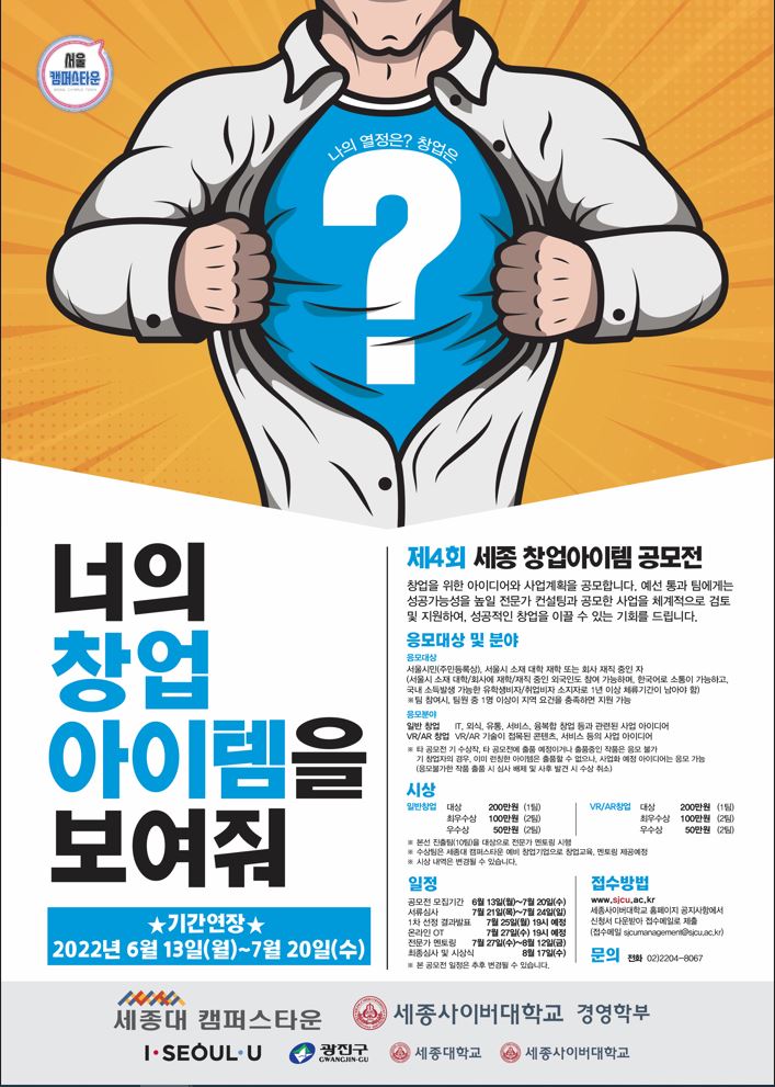 세종사이버대학교 경영학부와 세종대 캠퍼스타운 지원단의 핵심 추진목표 중 하나인 ‘일자리창출’을 위해 「세종 창업아이템 공모전」을 개최하고자 아래와 같이 모집․공고 합니다.