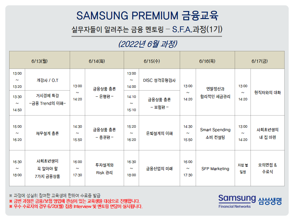 삼성생명에서 5일간 진행하는 금융교육과 1:1 취업 멘토링을 제공하는 금융아카데미 과정입니다.