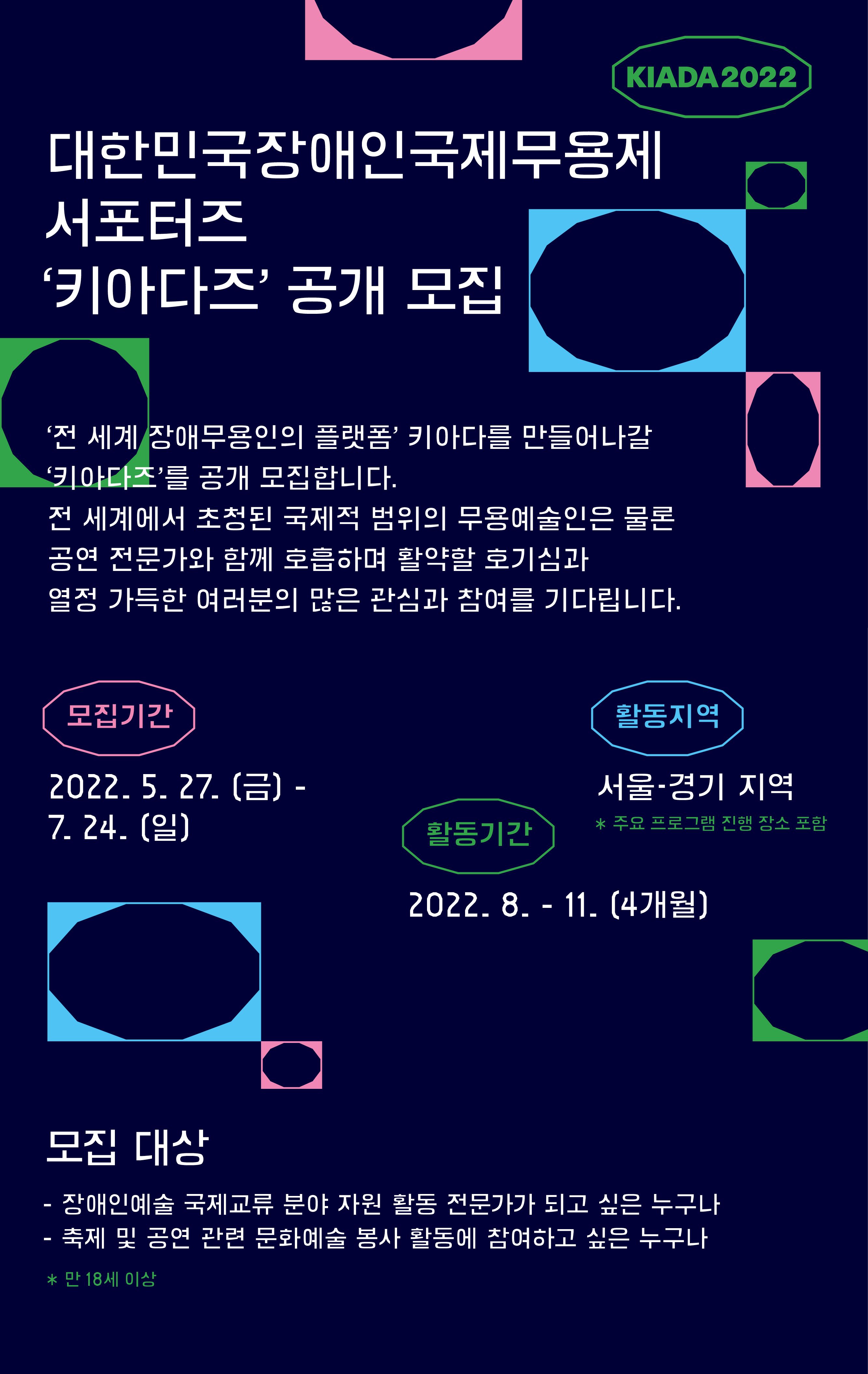 전 세계 장애무용인의 플랫폼 ‘2022년 제7회 대한민국장애인국제무용제(KIADA2022)’와 함께할 서포터즈 ‘키아다즈’를 공개 모집합니다.