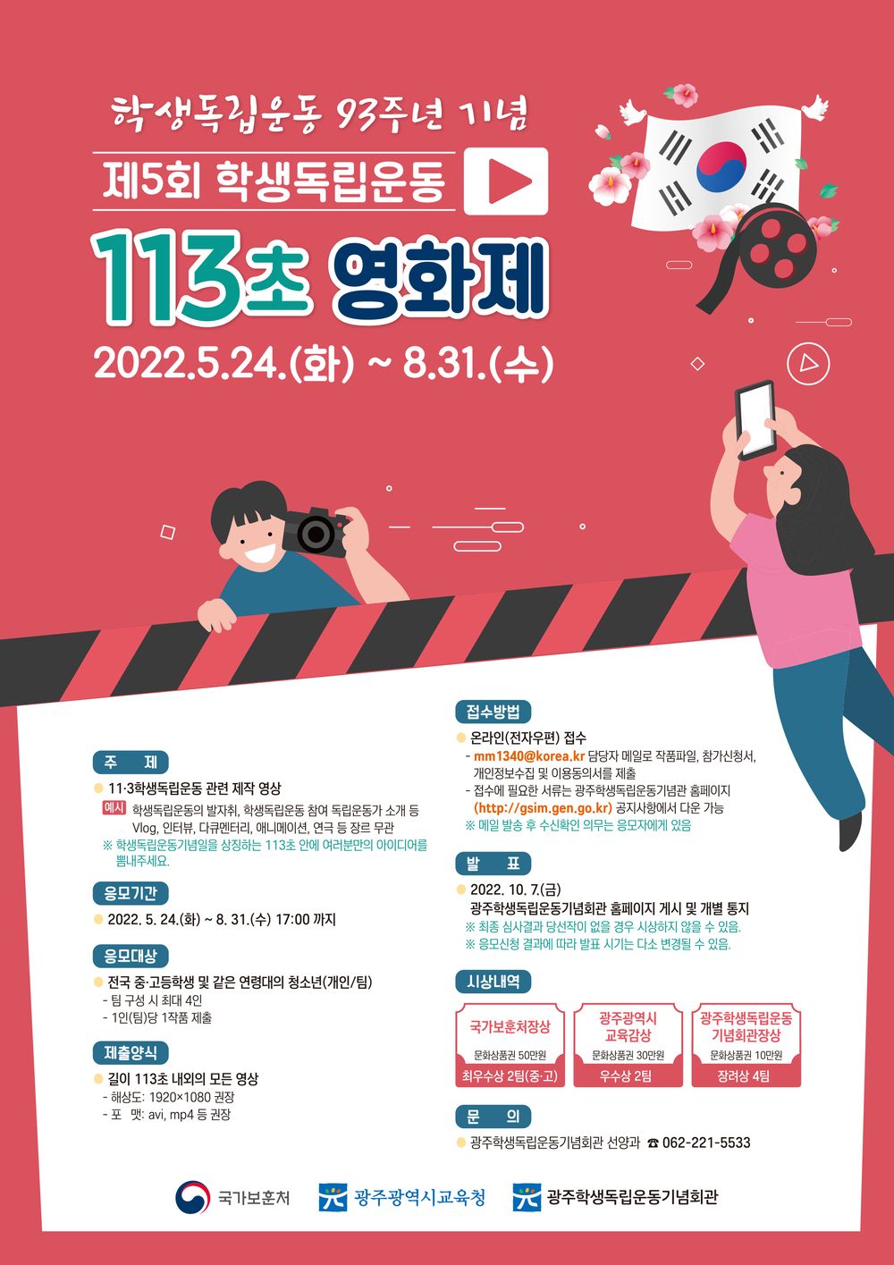 학생독립운동 제93주년을 맞아 학생독립운동 정신을 계승․발전․확산시키기 위한 제5회 학생독립운동 113초 영화제를 다음과 같이 공모합니다.