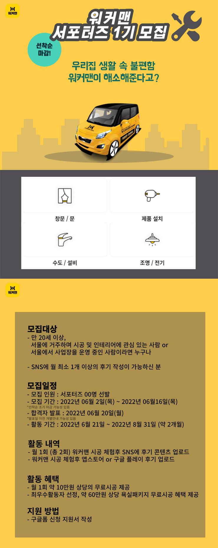 - 월 1회 (총 2회) 워커맨 시공 체험후 SNS에 후기 콘텐츠 업로드