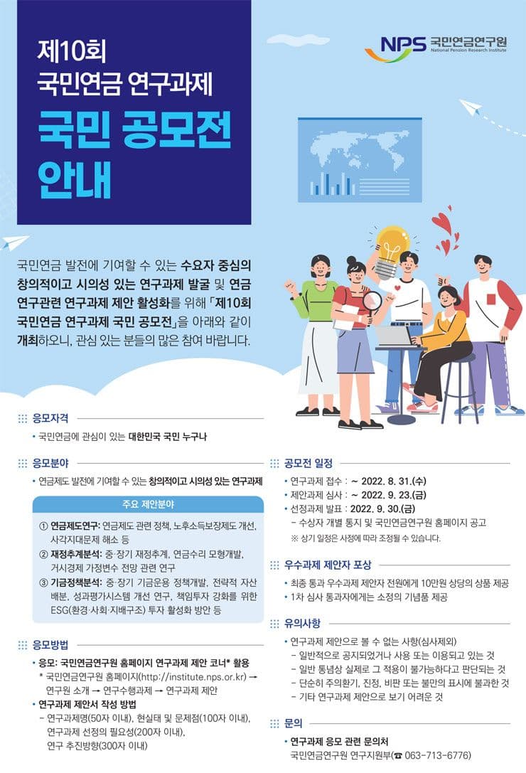 - 연구과제 응모 관련 문의처: 국민연금연구원 연구지원부(☎ 063-713-6776)