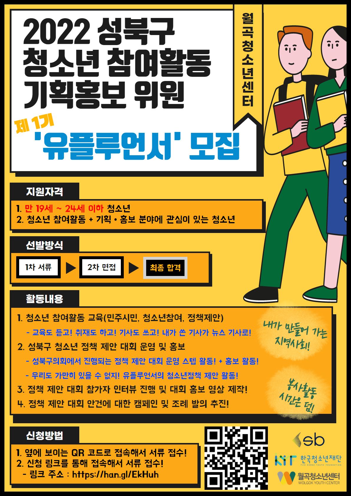 - 우리 '유플루언서'는 성북구 청소년 정책 제안 대회를 운영하는 대표 청소년으로써, 대회 운영 스텝 활동은 기본이고, 대회에 대한 전반적인 준비와 홍보를 진행한다! 유플루언서가 만들어 나가는 성북구 청소년 정책 제안 대회!