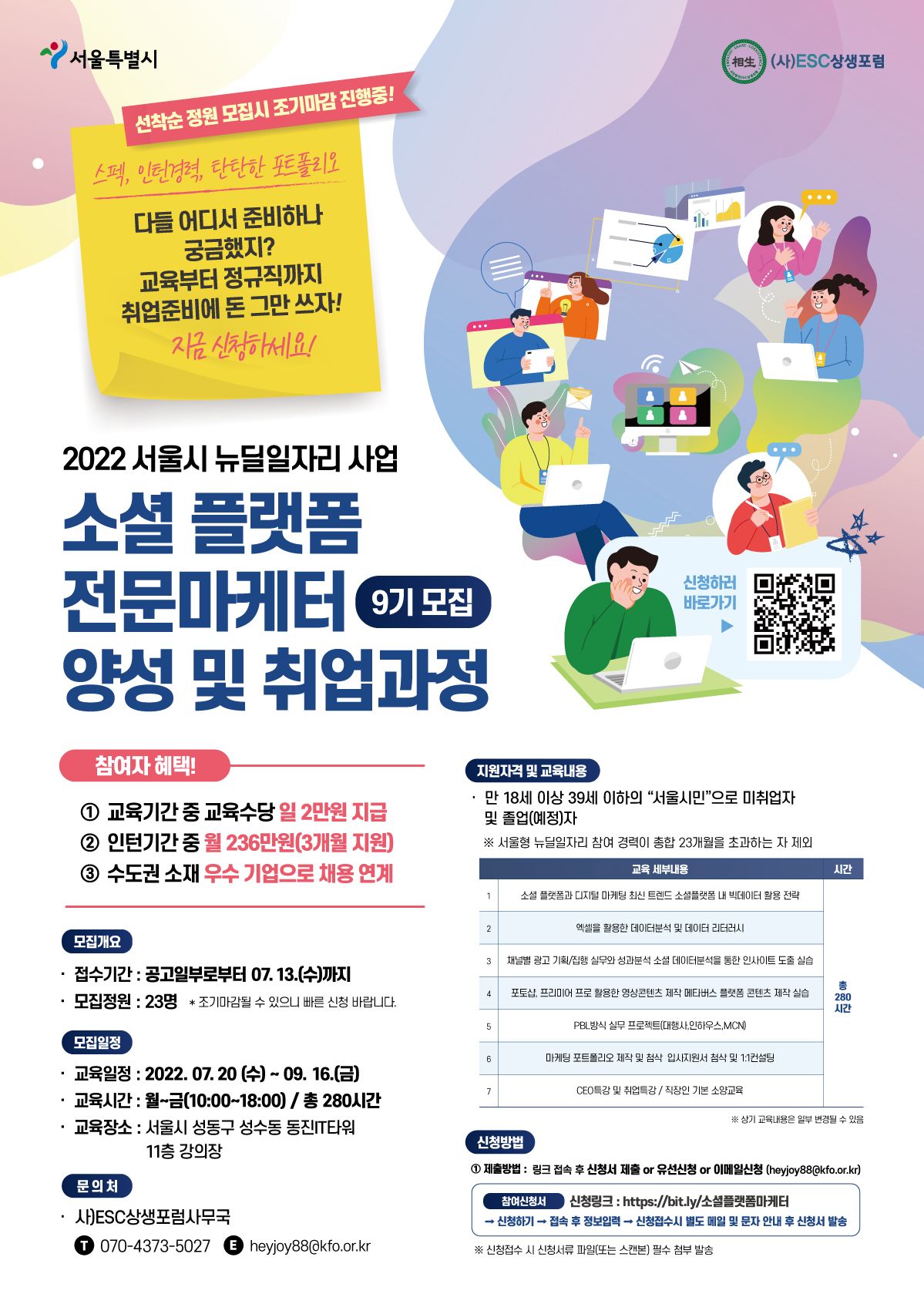 [서울시 뉴딜일자리] 소셜플랫폼 전문마케터 교육 및 청년인턴 과정 9기 참여자 모집