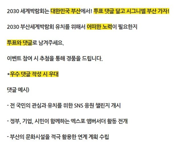 2030 세계박람회는 대한민국 부산에서! 투표 댓글 달고 시그니엘 부산 가자!