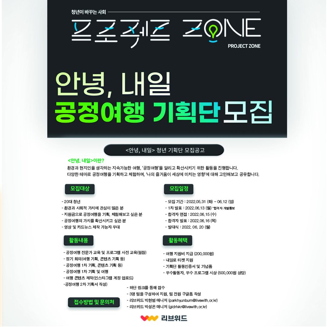 [안녕, 내일]은 환경과 현지인을 생각하는 지속가능한 여행, 즉 공정여행을 확산시키자는 목적으로 기획된 프로젝트 입니다. 다양한 테마로 공정여행을 기획하고 체험하며, '나의 즐거움이 세상에 미치는 영향'에 대해 곰곰이 생각해보고 공정여행의 가치를 확산시킬 청년 기획단을 모집합니다.