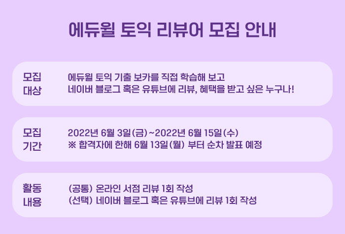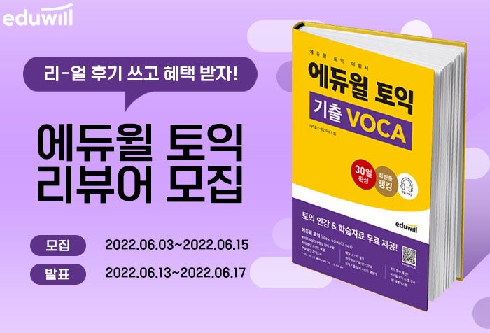 - 에듀윌 토익 기출보카를 직접 학습해 본 후, 블로그나 유튜브에 생생한 리뷰를 발행해주실 누구나!