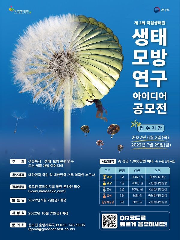 생물특성·생태 모방을 주제로 하는 연구 아이디어 수렴을 통해 국가 녹색산업 선도 기반 마련, 신규 연구 콘텐츠 확보 및 산업계와의 연구·개발 협력 네트워크 기반을 마련하고자 「제2회 국립생태원 생태모방연구 아이디어 공모전」을 추진하오니 많은 참여 바랍니다.