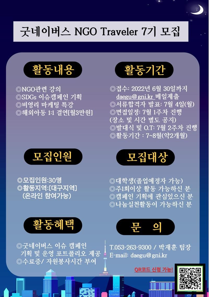 * 각 파일 제목은 [2022년 NGO Traveler 7기 지원 안내서_성명 / 지원서_성명] 으로 발송 필히 요망