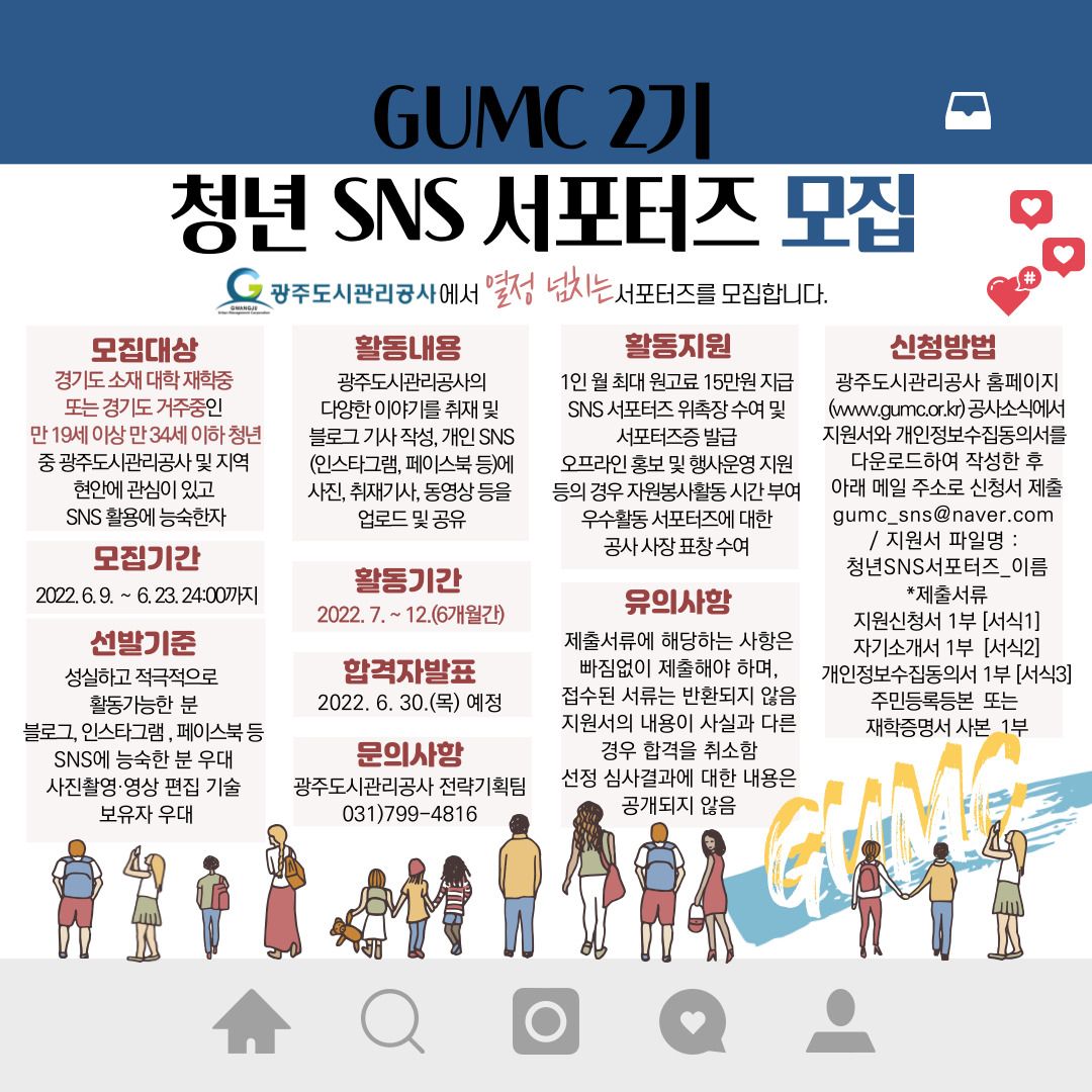 ○ 접수방법 : 광주도시관리공사 홈페이지(www.gumc.or.kr) 공사소식에서 지원서와 개인정보수집동의서를 다운로드하여 작성한 후 gumc_sns@naver.com 제출