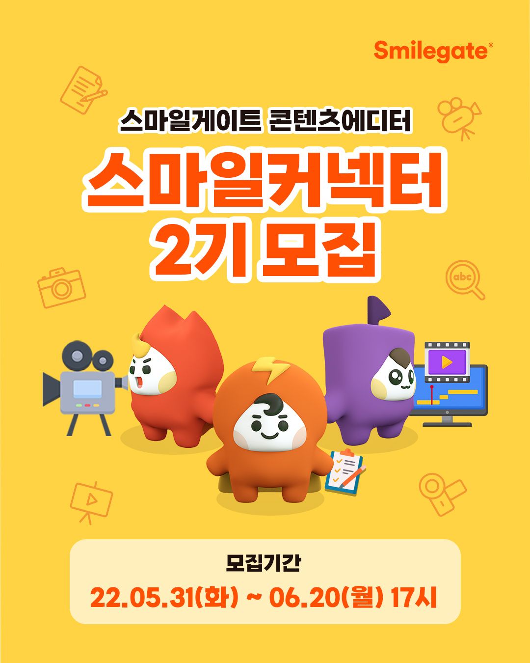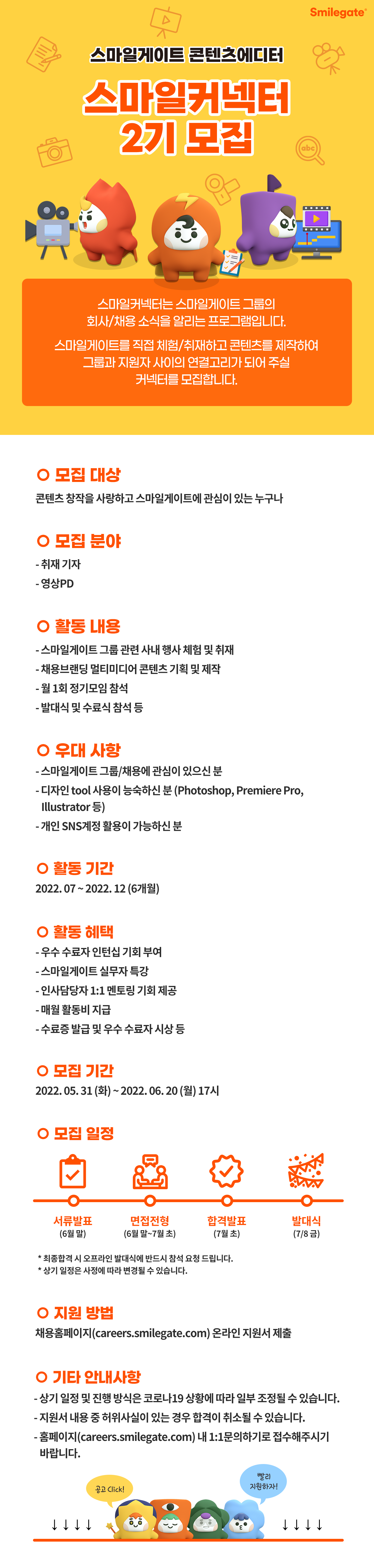 스마일게이트 그룹을 직접 체험/취재하고 콘텐츠를 제작하여 그룹과 지원자 사이의 연결고리가 되어 주실 커넥터를 모집합니다.