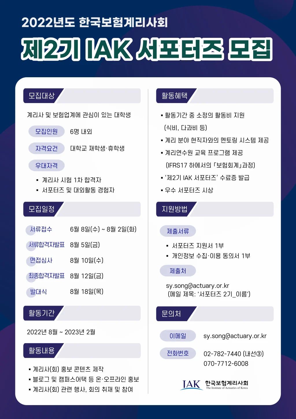 본회는 계리사 및 보험업계에 관심이 있는 대학생을 대상으로 ‘제2기 IAK 서포터즈’를 운영하고자 합니다. 이에 관련 콘텐츠를 제작, SNS 등을 활용한 온라인 홍보 및 캠퍼스 어택 등의 오프라인 활동을 진행할 수 있는 역량 있는 인재를 모집하고자 하오니, 많은 관심과 지원 바랍니다.