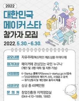 대국민 메이커 문화확산을 위한 「2022 대한민국 메이커 스타」대회를 개최하오니, 관심 있는 분들의 많은 참여 바랍니다.
