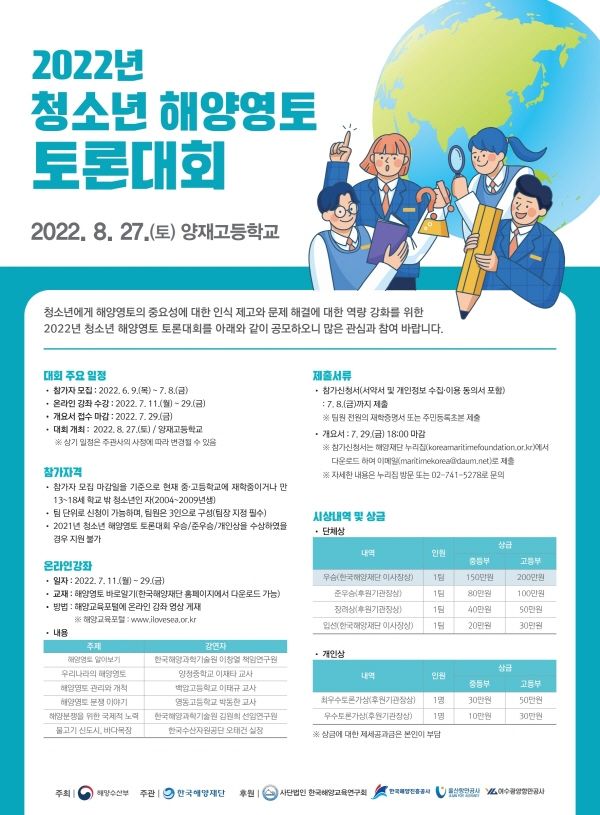 2022년 청소년 해양영토 토론대회를 아래와 같이 공모하오니 많은 관심과 참여 바랍니다.