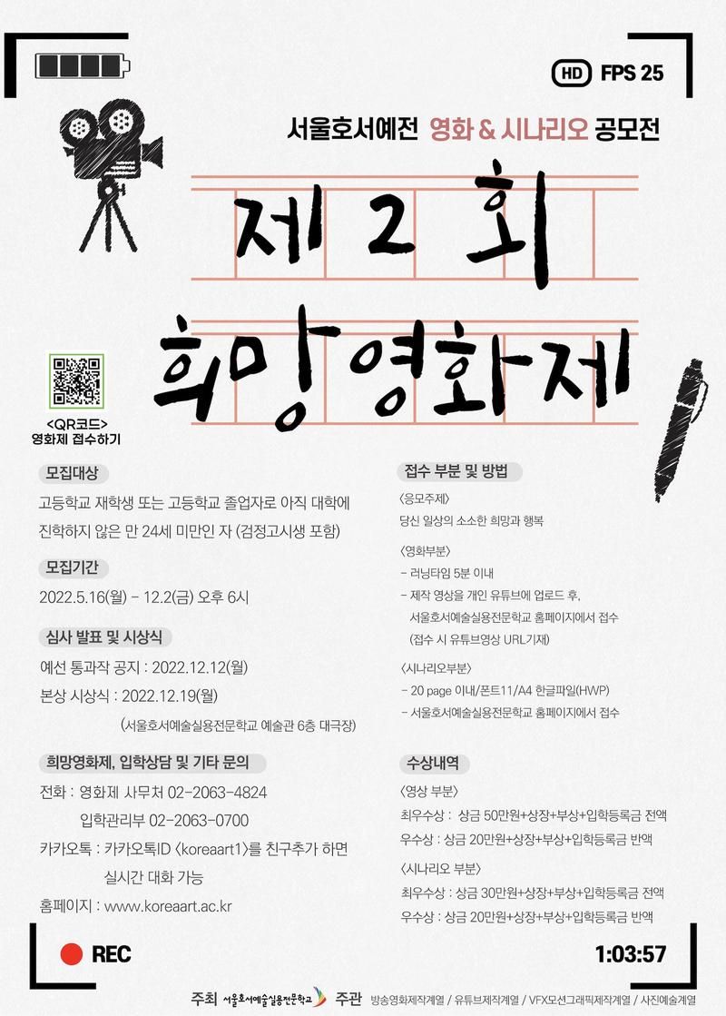 서울호서예술실용전문학교 방송영화제작계열 / VFX모션그래픽제작계열에서 제2회 희망영화제를 진행하고 있습니다.