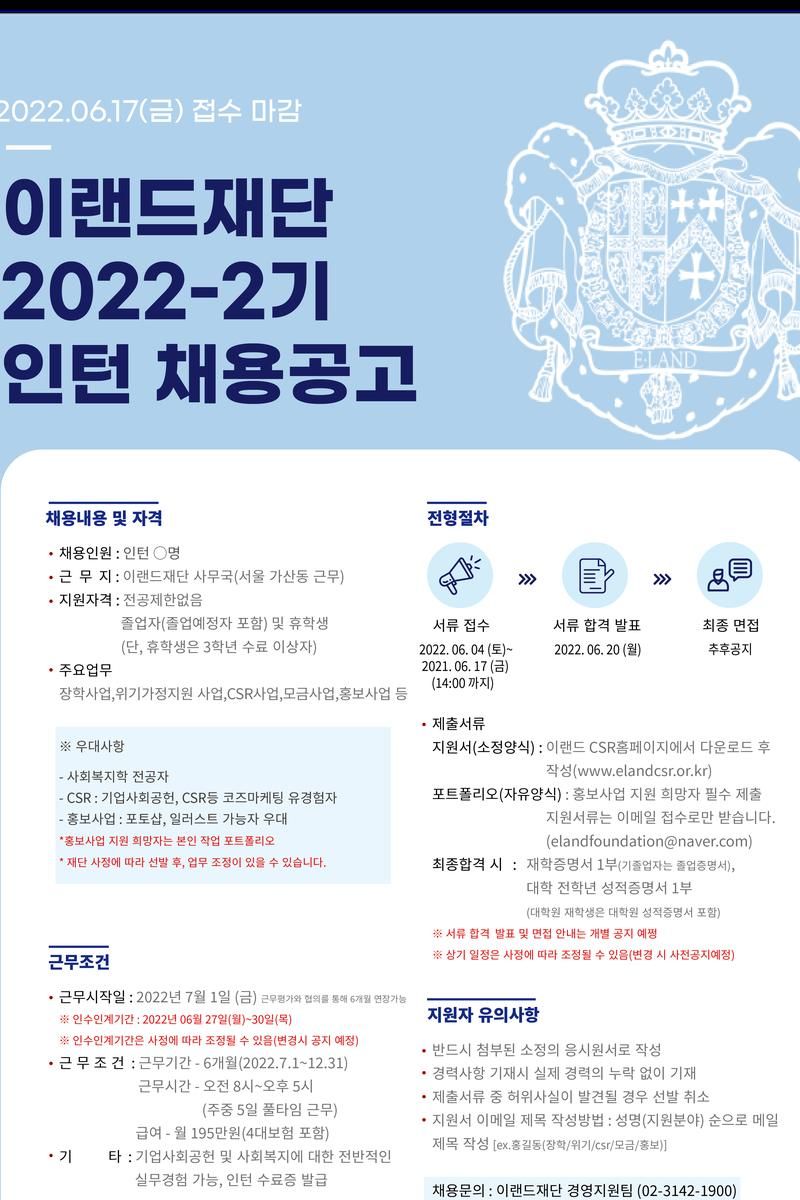 - 지원서류는 이메일 접수로만 받습니다.(elandfoundation@naver.com)