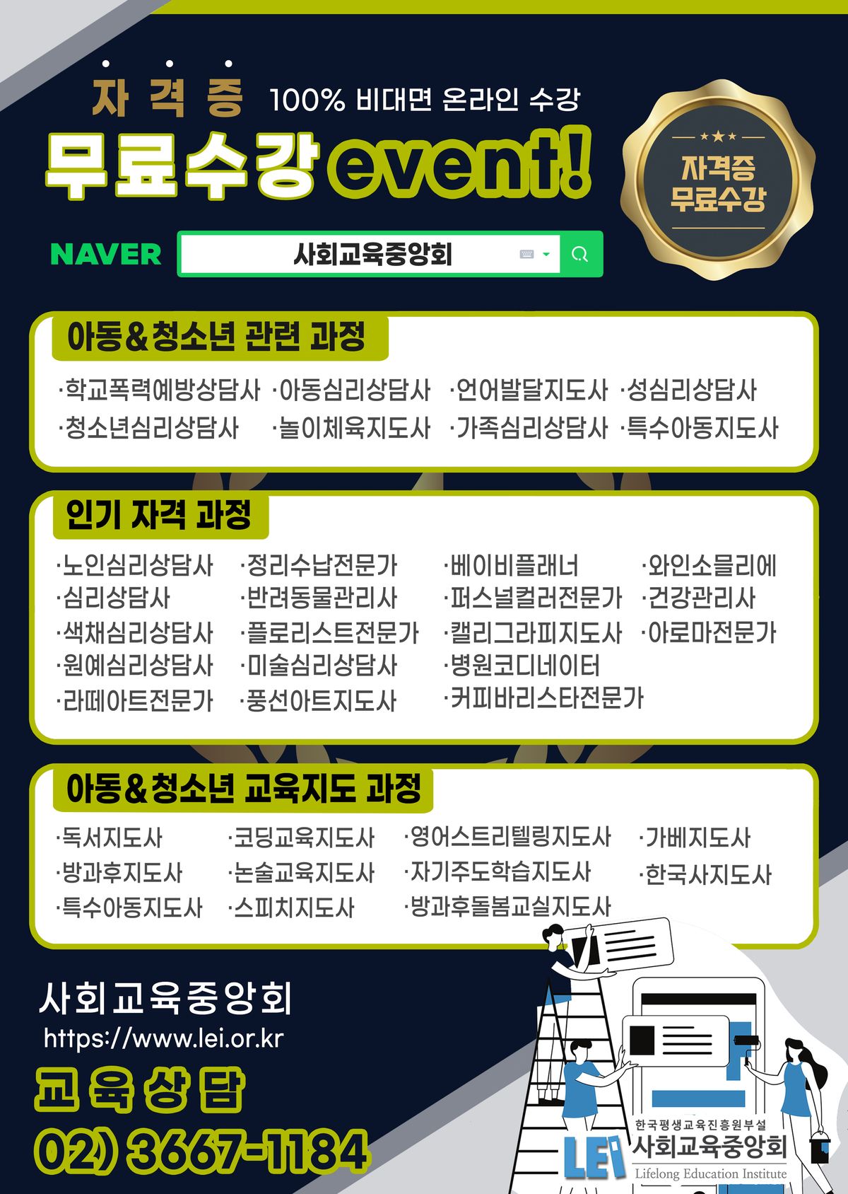 사회교육중앙회에서 사회공헌활동의 일환으로 조건없이 누구에게나 무료수강 기회를 제공합니다.