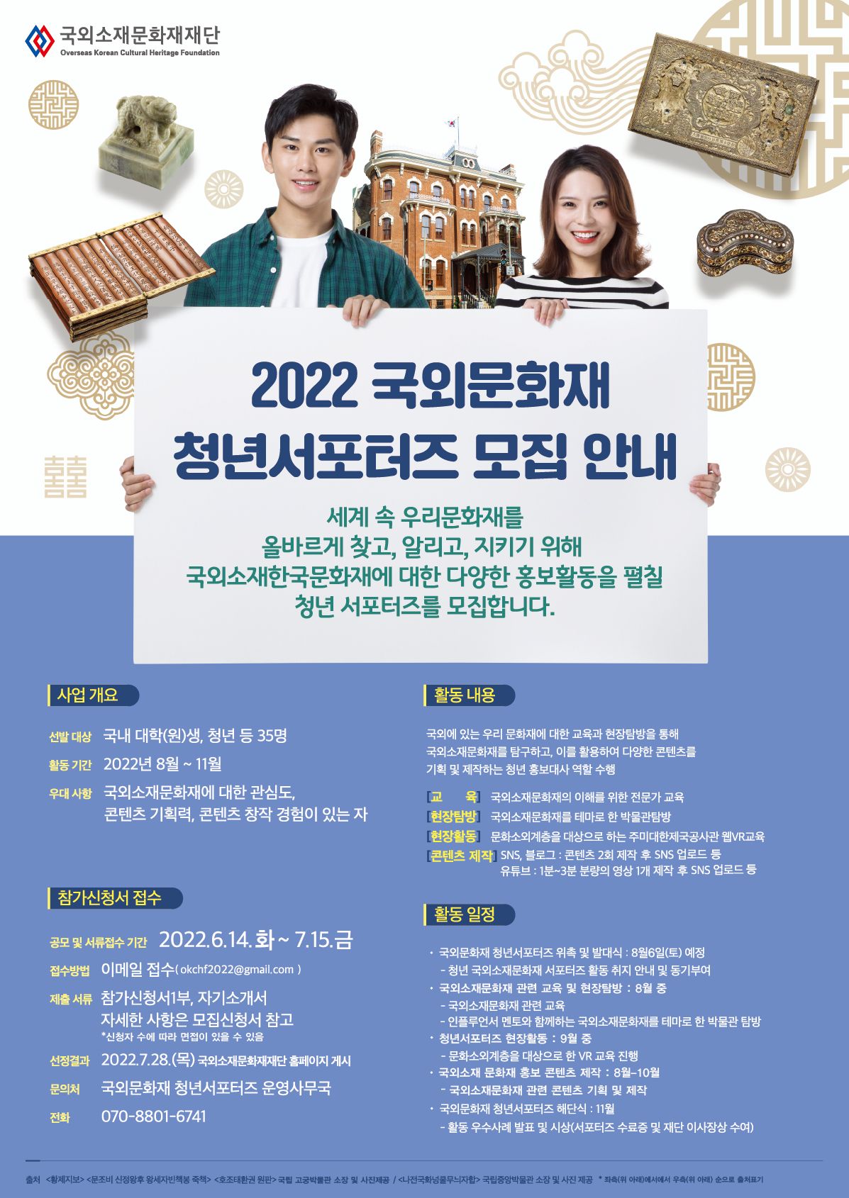 국외소재문화재재단은 세계 속 우리문화재를 올바르게 찾고, 알리고, 지키기 위해 국외 소재 한국 문화재에 대한 다양한 홍보 활동을 펼칠 청년 서포터즈를 모집합니다.