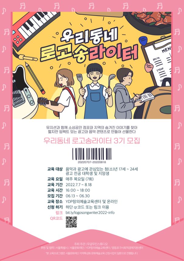 <우리동네 로고송라이터>는 뮤지션과 청년, 지역 소상공인이 만나 새로운 인연을 만들고, 음악과 광고를 만들어 지역에 활력을 불어넣는 사회적 예술 프로젝트입니다.