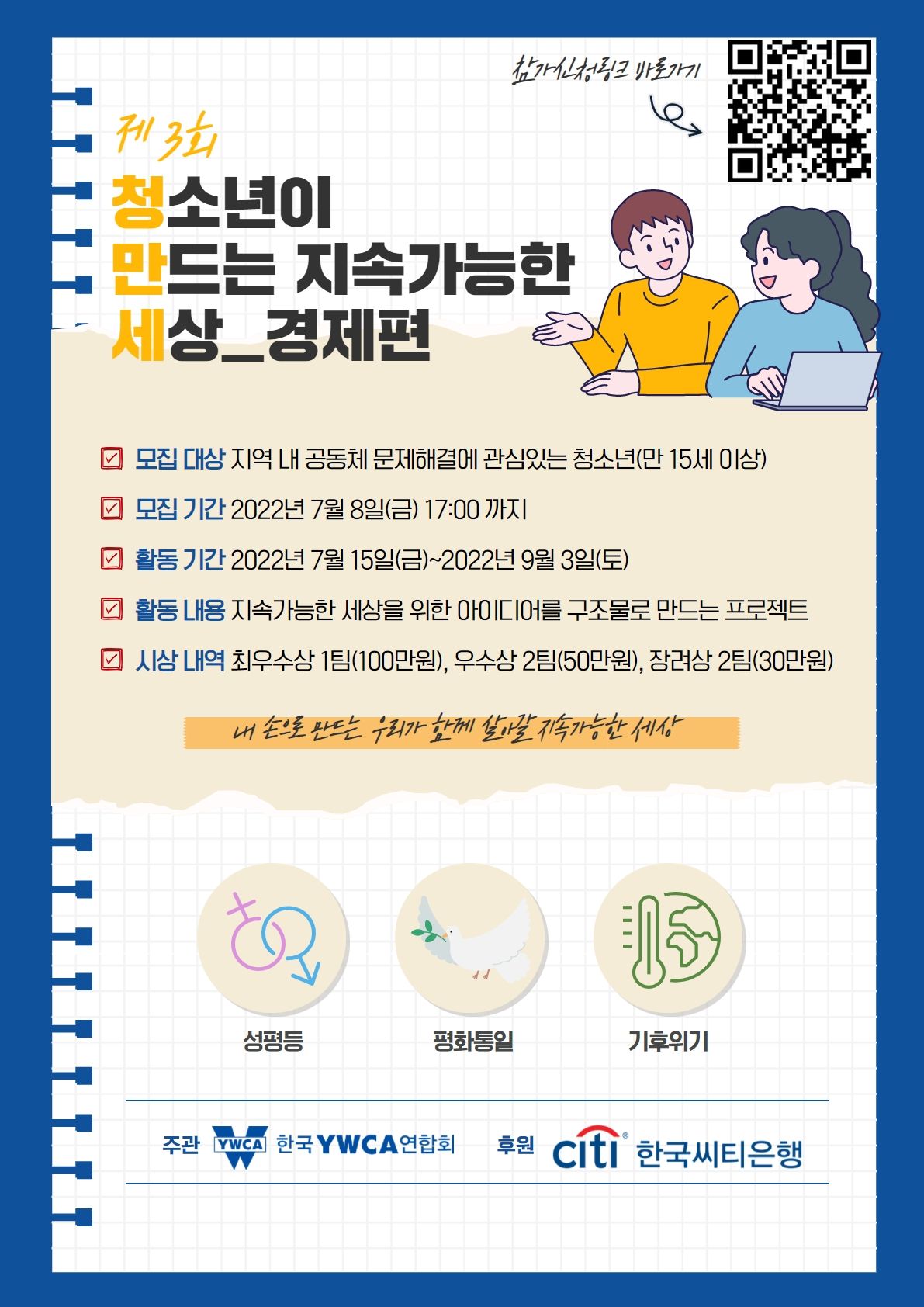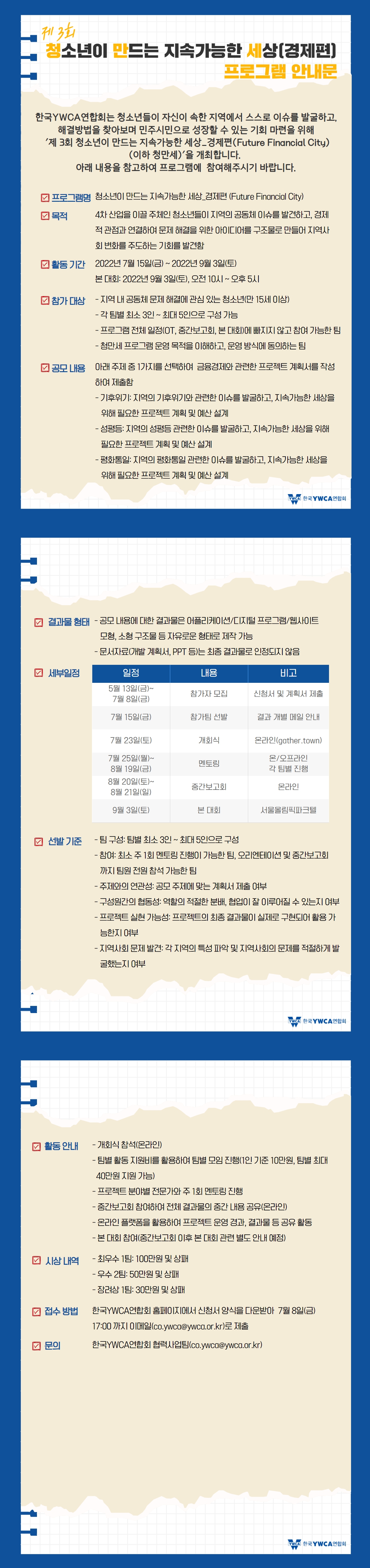한국YWCA연합회는 청소년들이 자신이 속한 지역에서 스스로 이슈를 발굴하고, 해결 방법을 찾아보며 민주시민으로 성장할 수 있는 기회 마련을 위해 ‘제 3회 청소년이 만드는 지속가능한 세상_경제편(Future Financial City)(이하 청만세)’을 개최합니다. 아래 내용을 참고하시어 프로그램에 참여해주시기 바랍니다.