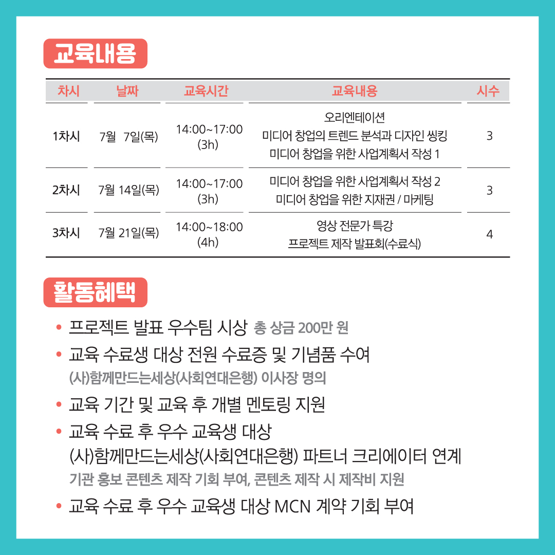 ㅇ 교육 수료 후 우수 교육생 대상 (사)함께만드는세상(사회연대은행) 파트너 크리에이터 연계