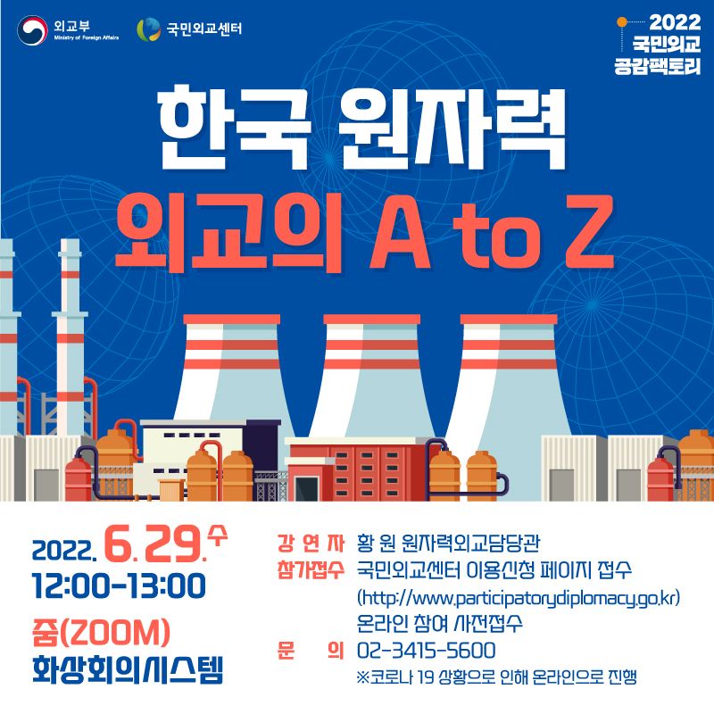 외교부는 6월 29일(수) 12:00-13:00 “한국 원자력 외교의 A to Z”를 주제로 국민외교 공감팩토리를 개최할 예정입니다.