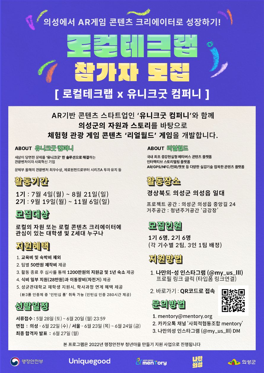 요즘 가장 주목받는 관광벤처, 유니크굿 컴퍼니와 함께 의성의 자원 및 스토리를 활용한 현실강화형 메타버스 플랫폼 '리얼월드' 게임을 개발하는 프로젝트를 진행합니다.