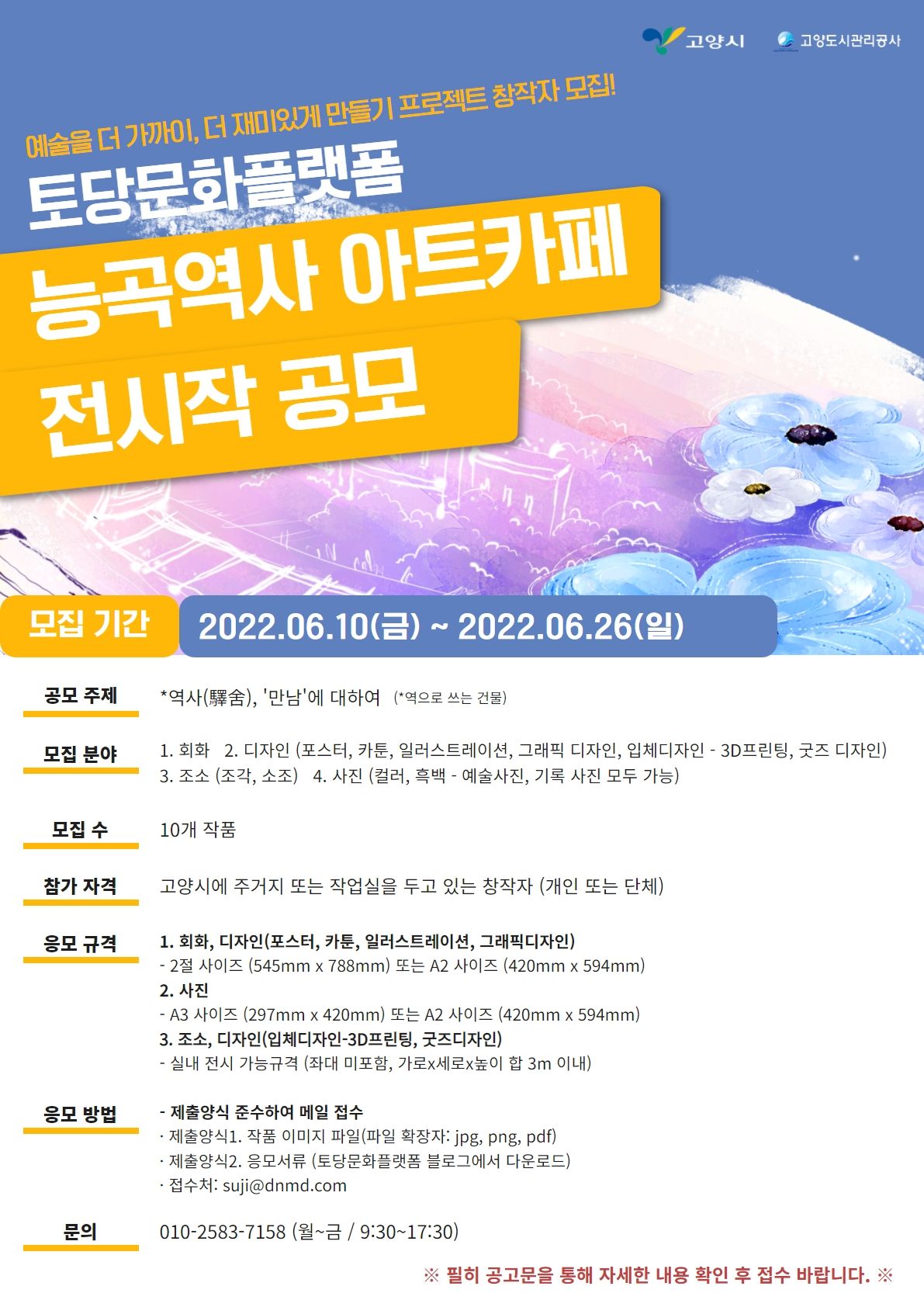 도시재생으로 새롭게 시작하는 고양시 능곡에 소재한 (구)능곡역 ‘토당문화플랫폼’이 문화예술 공간으로 재탄생합니다. 공간의 정체성을 확립하고 시내·외민들의 예술 향유 기회를 마련하고자 7~9월 간 ‘능곡역사(驛舍) 아트카페 전시회’를 개최합니다.