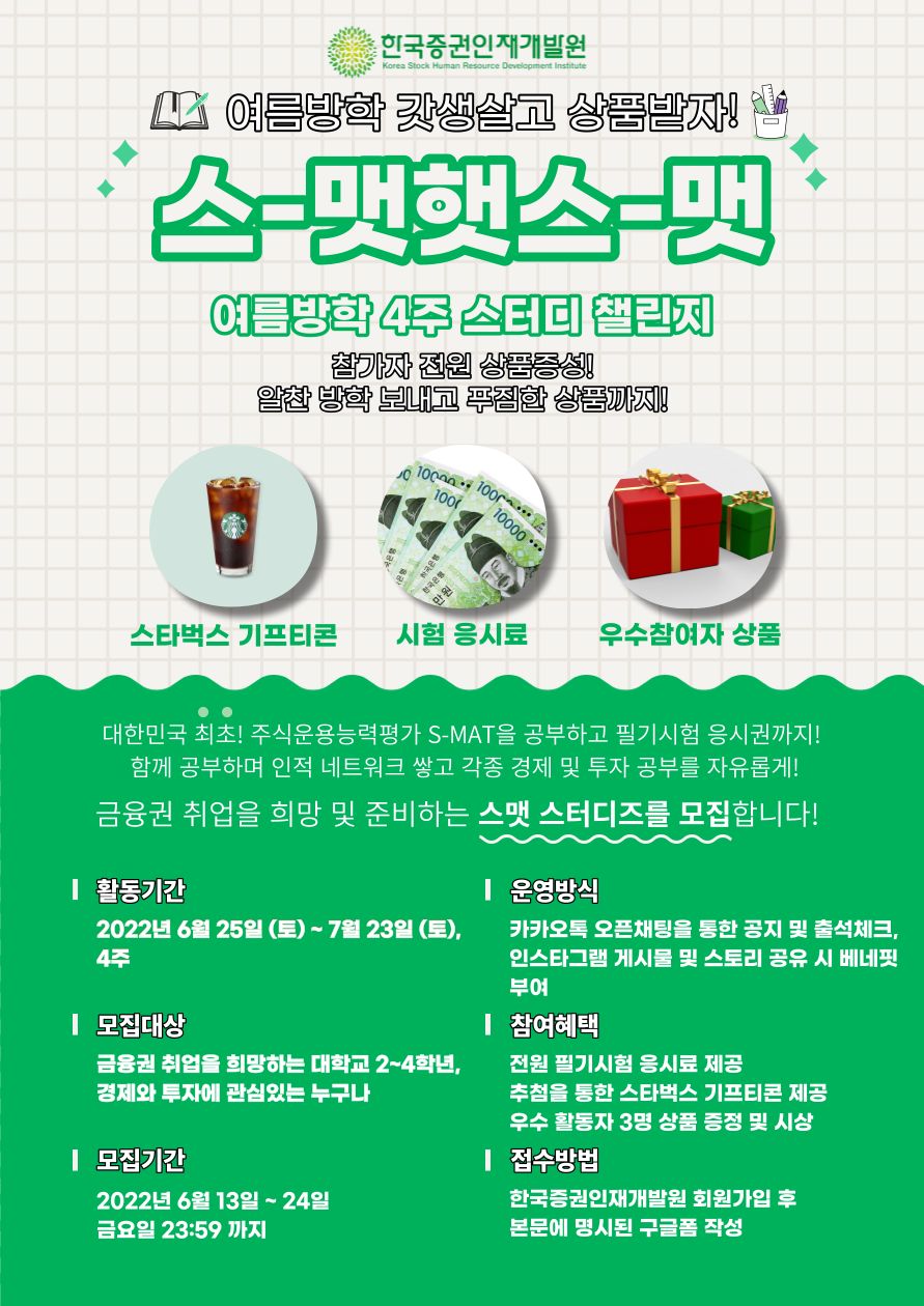 여름방학동안 챌린지하면서 주식공부도 하고, 스-맷 필기시험 무료 응시해 자격증도 따보자!