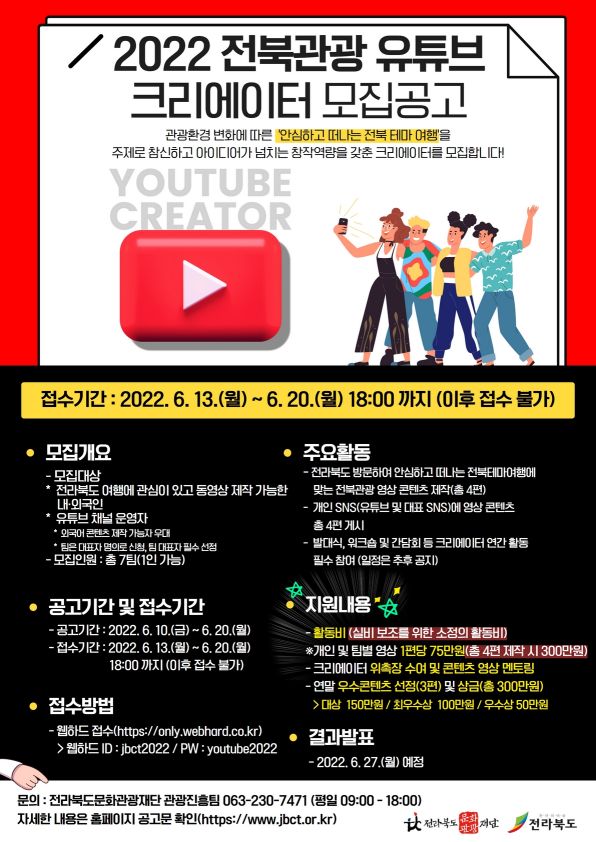 관광환경 변화에 따른 ’안심하고 떠나는 전북 테마 여행’ 참신하고 아이디어가 넘치는 창작역량을 갖춘 크리에이터를 모집합니다. * 하단의 모집 공고 이미지를 참고해주세요!