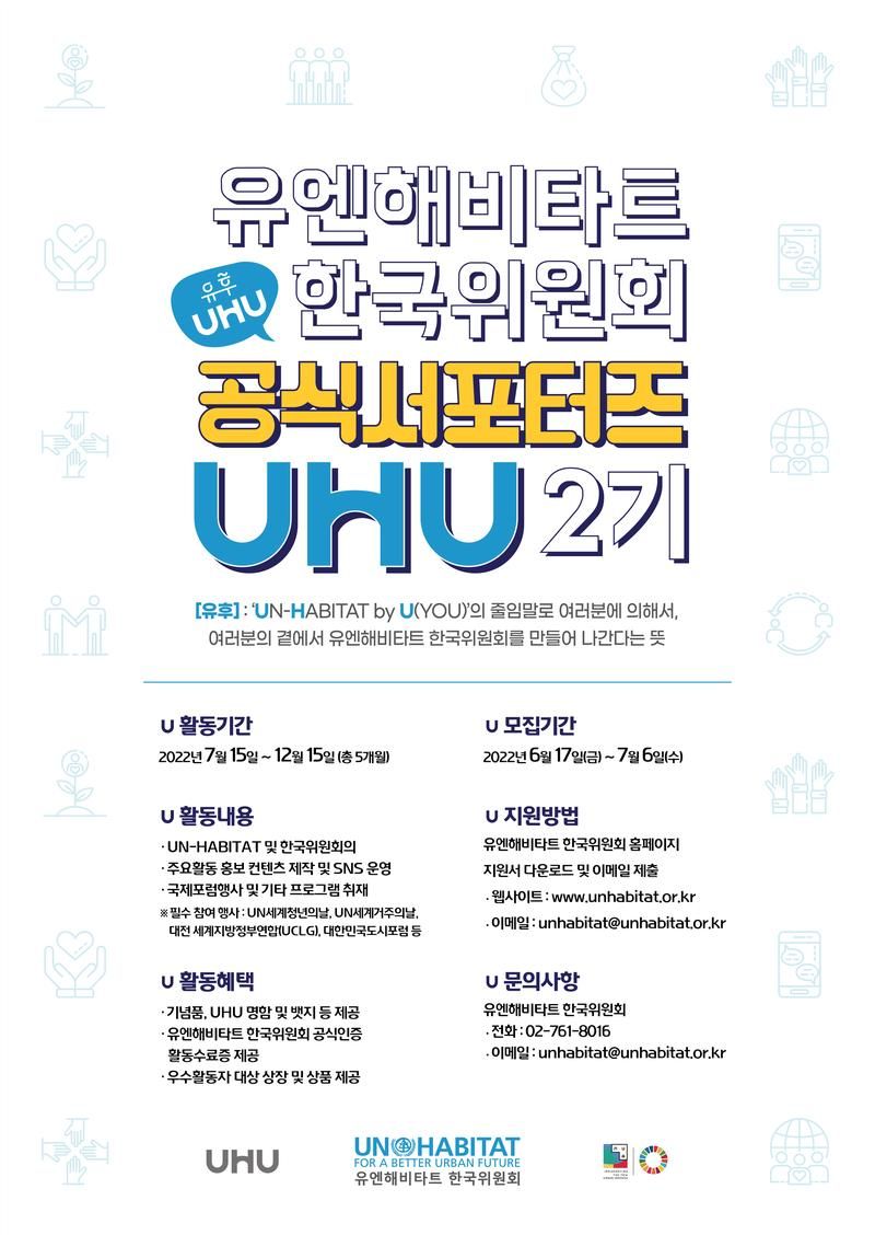: UN 산하에서 지속가능한 도시와 인간정주 분야를 관장하는 국제기구 UN-HABITAT의 첫 국가위원회 ‘유엔해비타트 한국위원회(Korean National Committee for UN-HABITAT’를 함께 만들어갈 청년 서포터즈 ‘UHU(UN-HABITAT by You)’를 모집합니다.