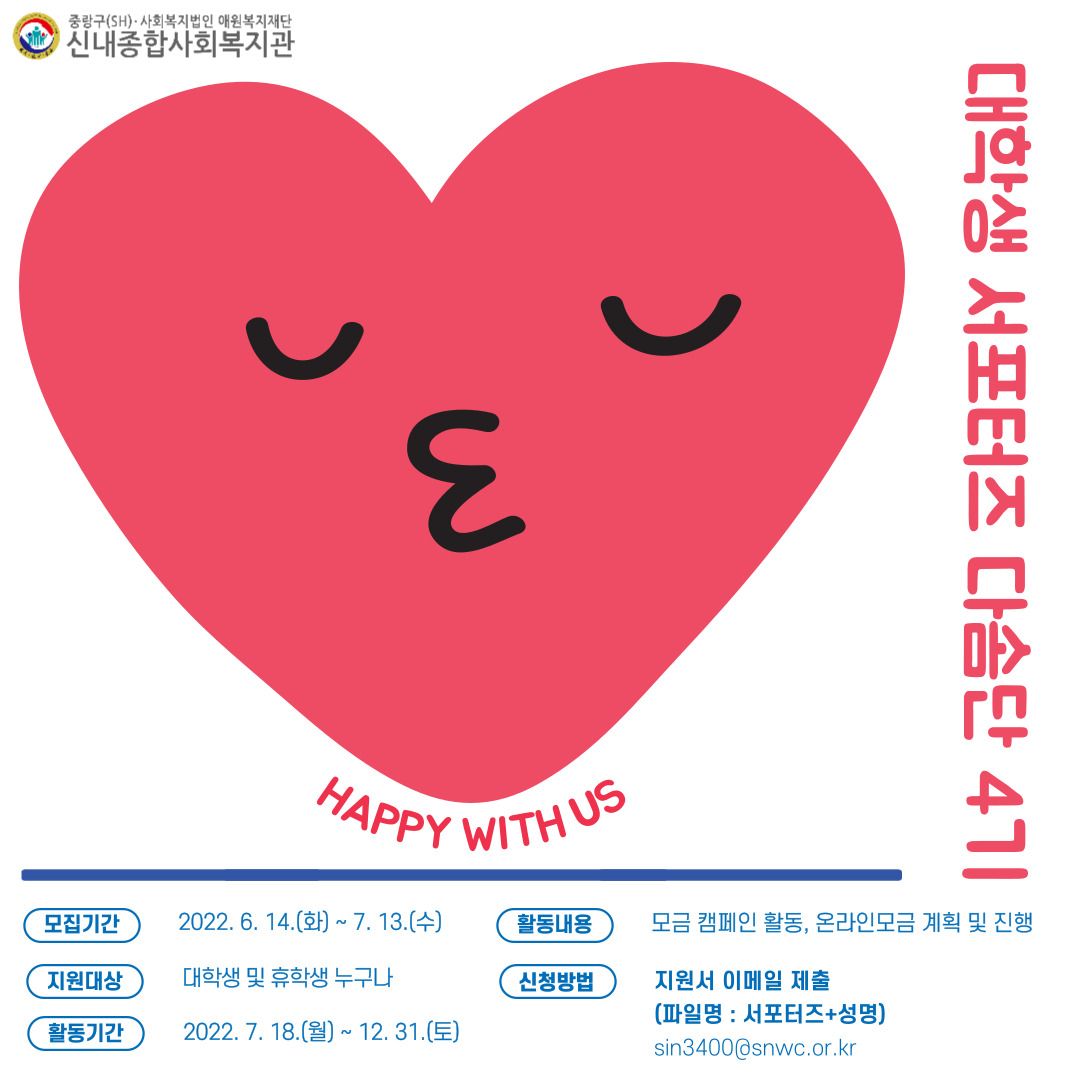 신내종합사회복지관에서는 대학생 서포터즈 다솜단을 운영하여 대학생 여러분에게 복지현장에서의 다양한 경험을 할 수 있도록 지원하고 있습니다. 아래 내용을 참고하여 활동을 희망하는 분께서는 신청하시기 바랍니다.