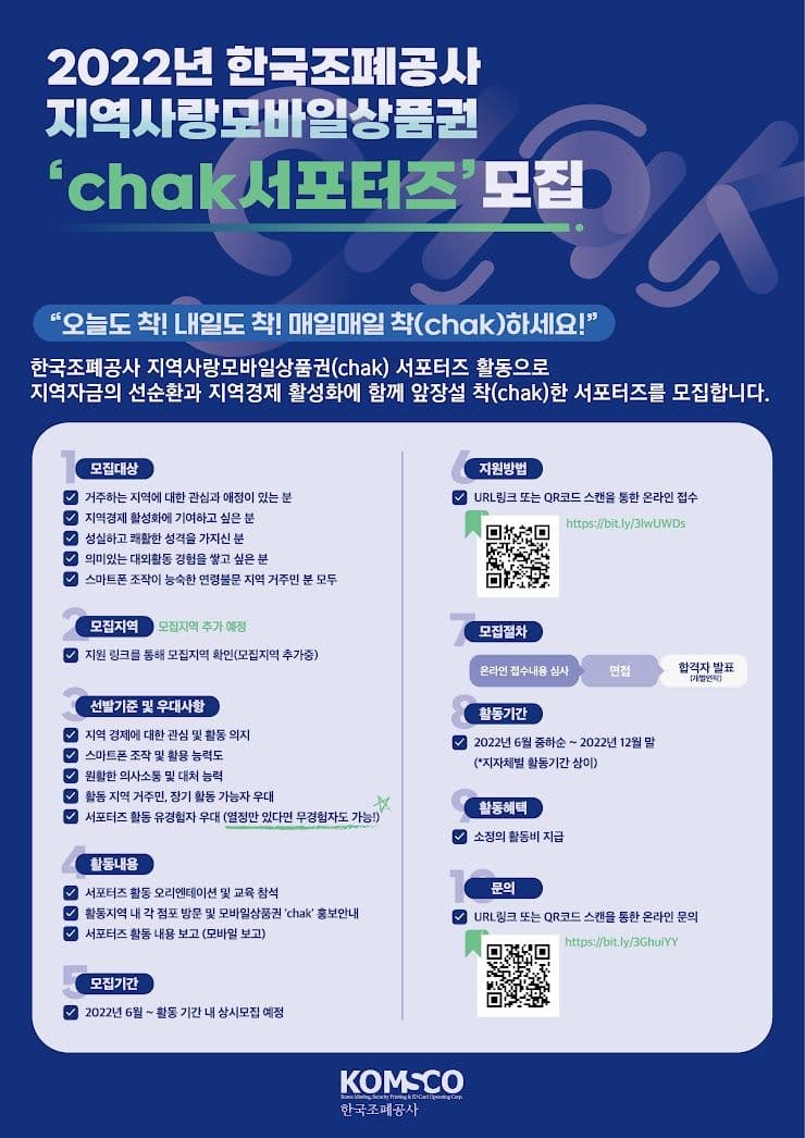 [한국조폐공사KOMSCO] 지역사랑 모바일 상품권 chak서포터즈 모집