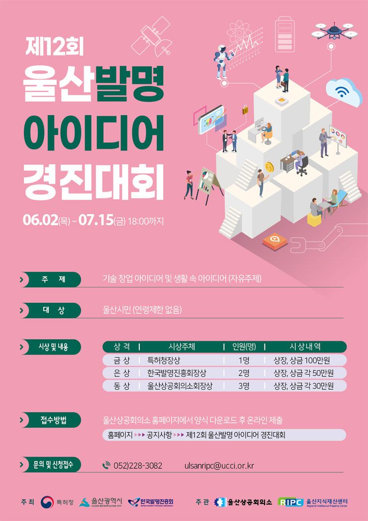 - 주소 : 울산광역시 남구 돋질로 97 울산상공회의소 2층 울산지식재산센터 발명아이디어경진대회 담당자 앞 우) 44689