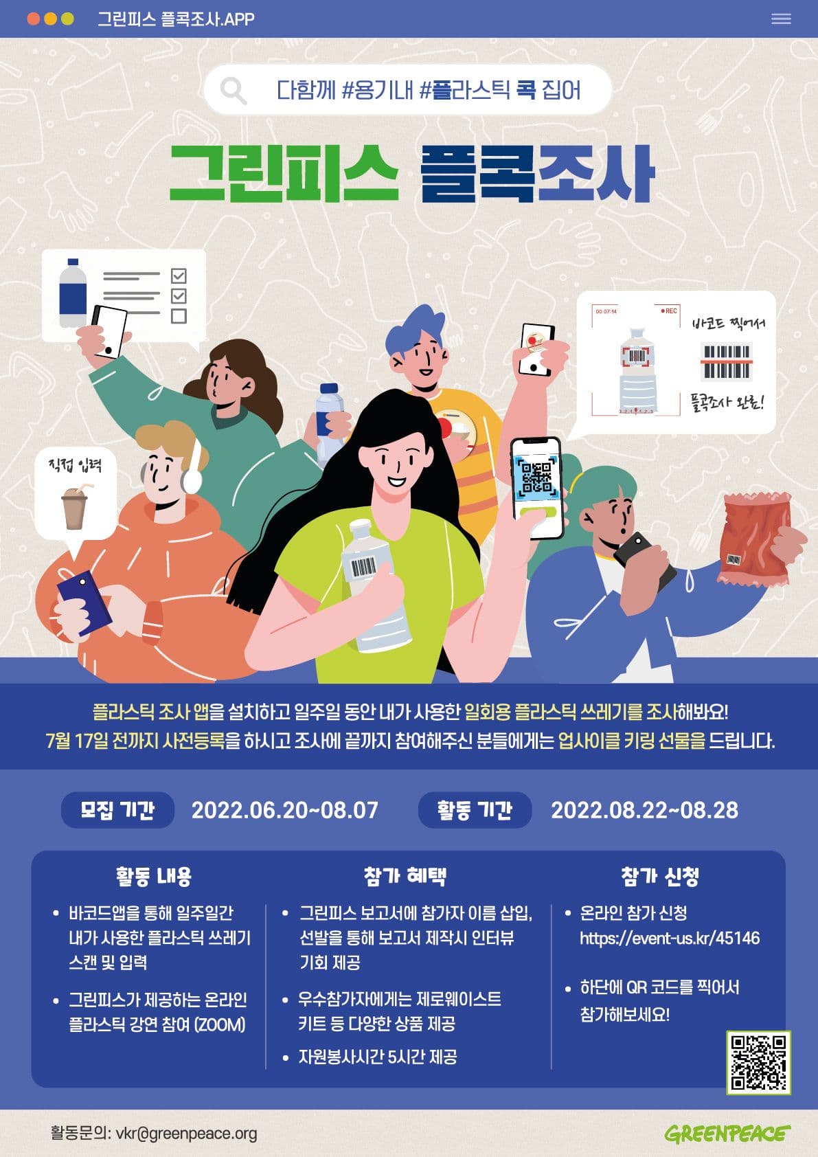 아래 신청 링크를 클릭하여 참가 신청해주세요! 7월 17일 자정 전에 신청하면 선물도 받아갈 수 있습니다! ‘그린피스 플콕조사’에 대해 궁금하신 사항은 vkr@greenpeace.org 로 문의 주시길 바랍니다. (답변은 영업일 기준 2일 내외가 소요됩니다.)