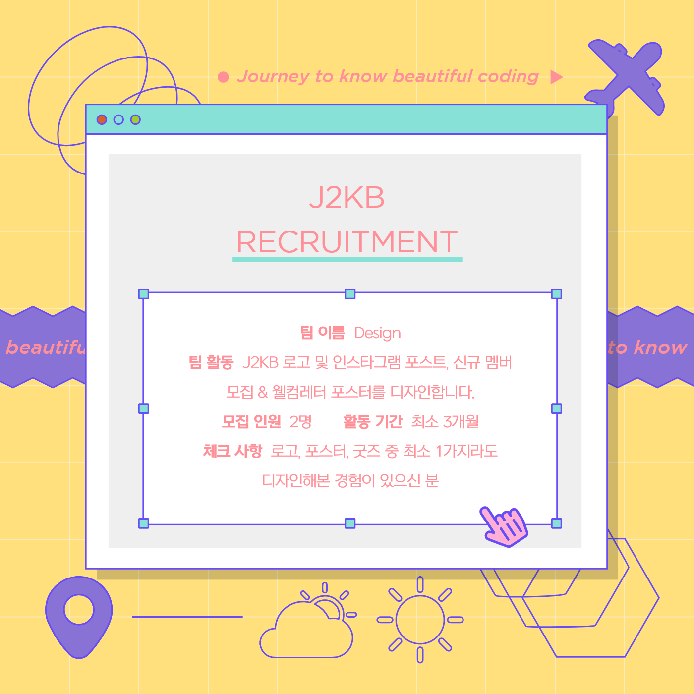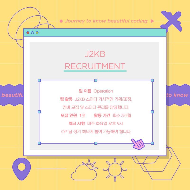 J2KB 코딩 스터디에서 Contents, Design, Operation 크루 멤버를 모집합니다!
