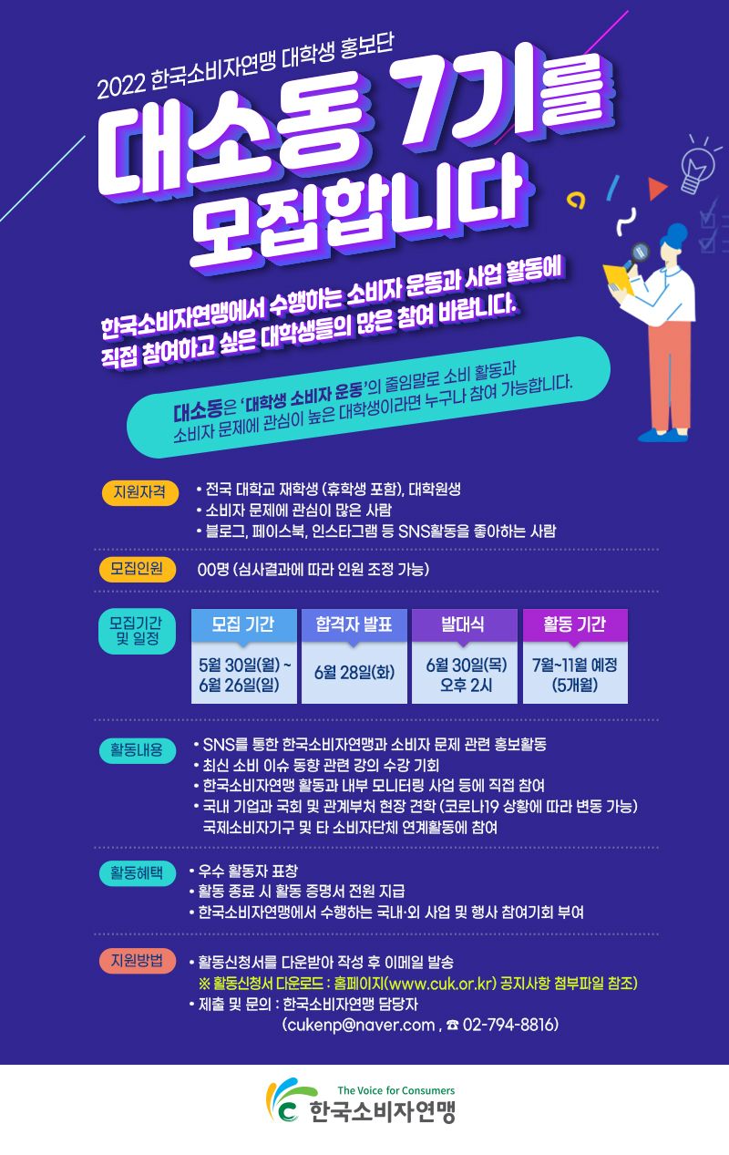 한국소비자연맹 대학생 홍보단 대소동 7기를 모집합니다.