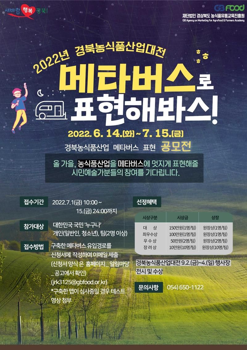 ‘경북 농식품산업’을 메타버스로! 경북농식품산업에 대한 여러분의 생각과 창의성을 자유롭게 공유해주세요! 올 가을, 농식품산업을 멋지게 표현해줄 여러분의 참여를 기다립니다.